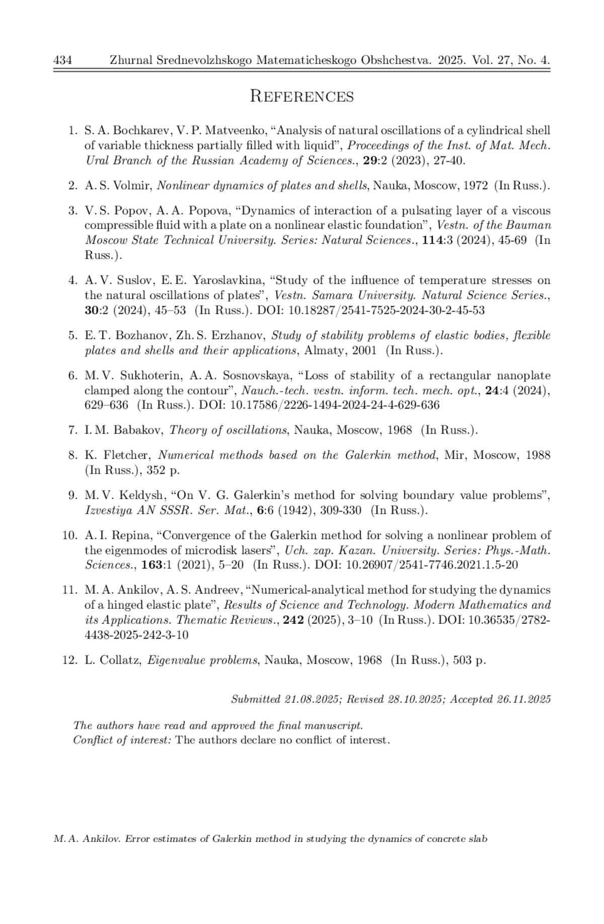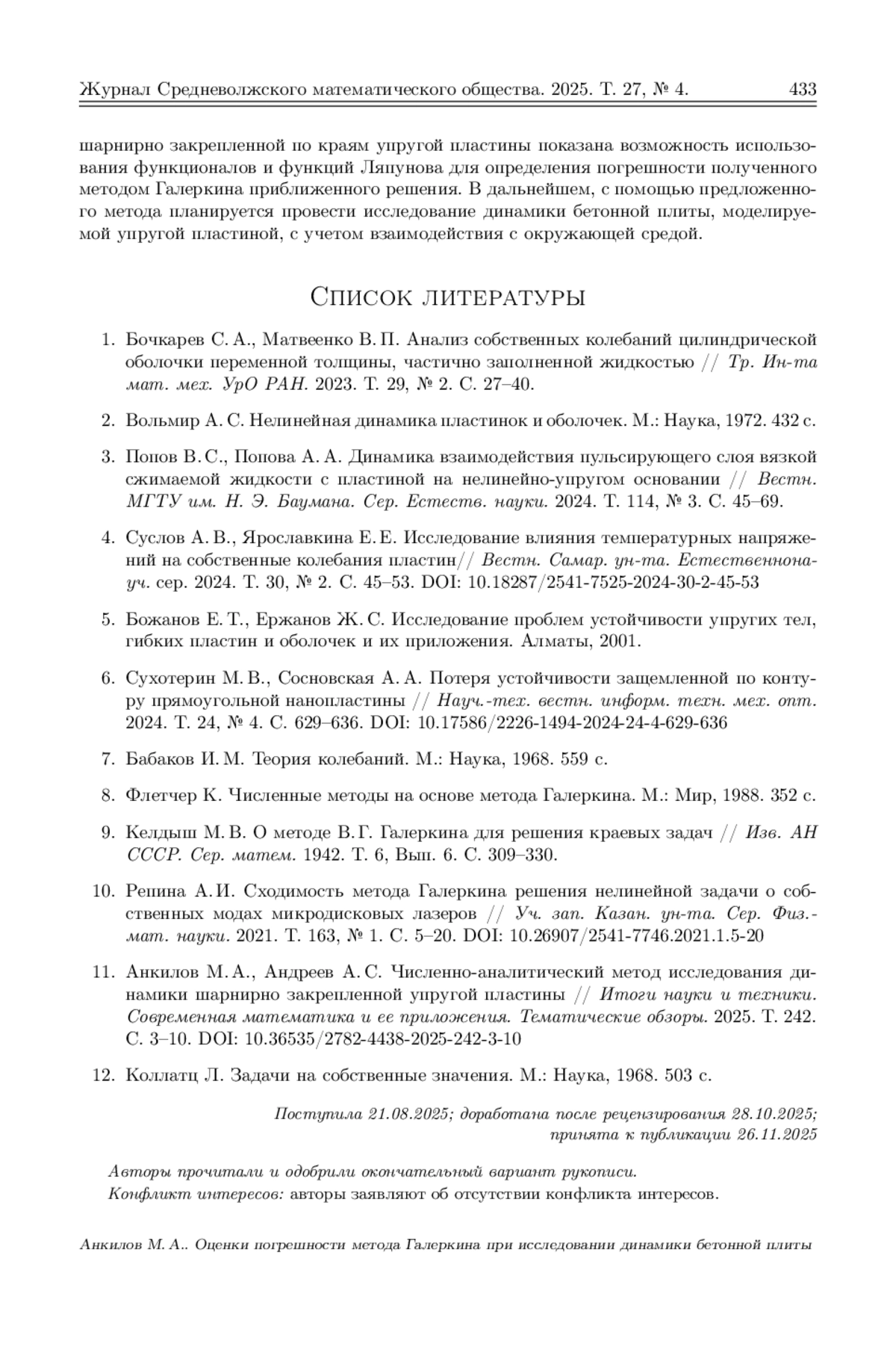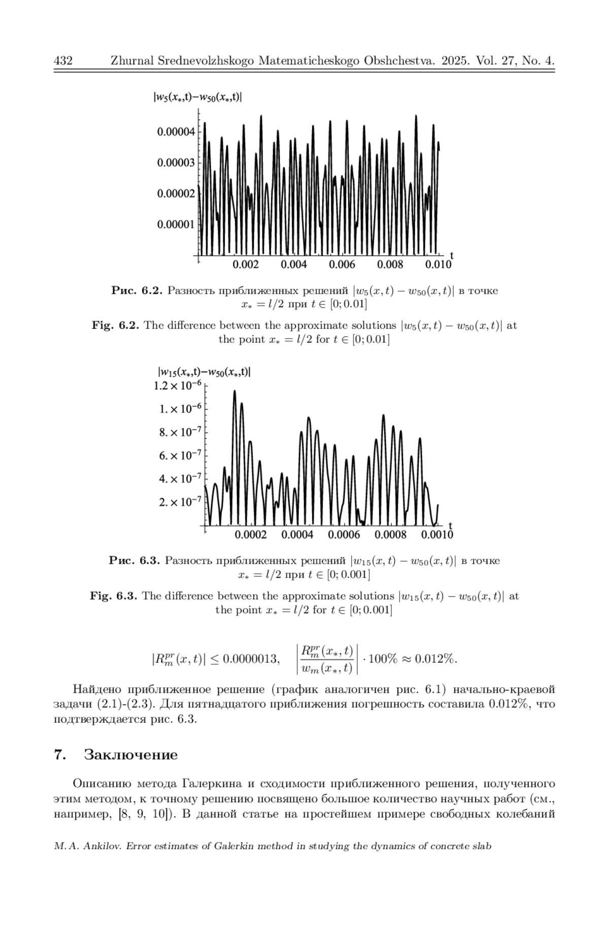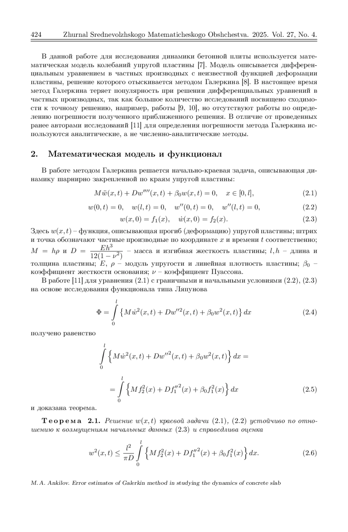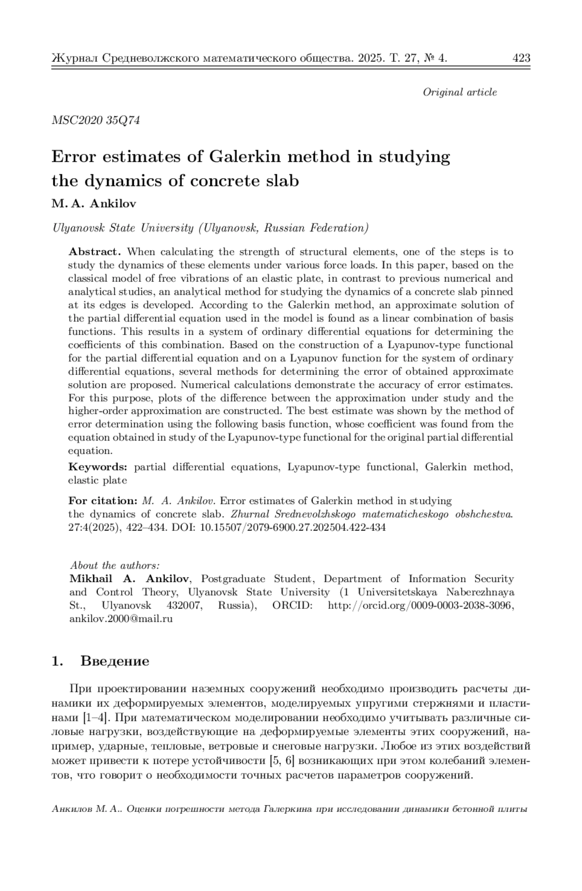 При расчете на прочность элементов строительных конструкций одним из этапов является исследование динамики этих элементов при различных силовых нагрузках. В данной работе на основе классической модели свободных колебаний упругой пластины, в отличие от проведенных ранее численно-аналитических исследований, разрабатывается аналитический метод исследования динамики шарнирно закрепленной по краям бетонной плиты. Согласно методу Галеркина приближенное решение дифференциального уравнения в частных производных, используемого в модели, отыскивается в виде линейной комбинации базисных функций. В результате получена система обыкновенных дифференциальных уравнений для определения коэффициентов этой комбинации. На основе построения функционала типа Ляпунова для дифференциального уравнения в частных производных и функции Ляпунова для системы обыкновенных дифференциальных уравнений предложено несколько способов определения погрешности полученного приближенного решения. На основе численных расчетов показана точность полученных оценок этой погрешности. Для этого построены графики разности исследуемого приближения и приближения высшего порядка. Наилучшую оценку показал способ определения погрешности с помощью следующей базисной функции, коэффициент при которой найден из уравнения, полученного на основе исследования функционала типа Ляпунова для исходного дифференциального уравнения в частных производных.