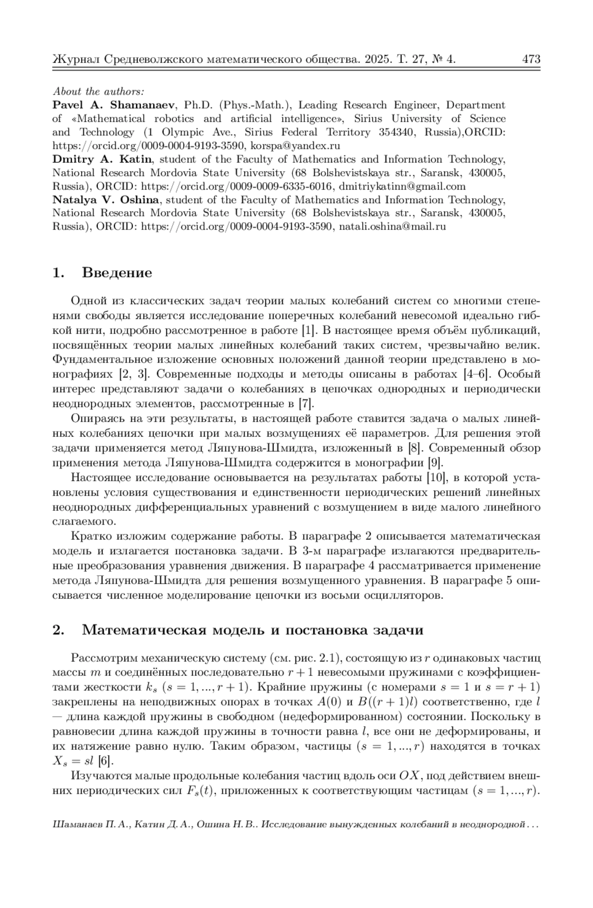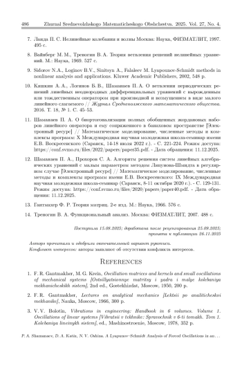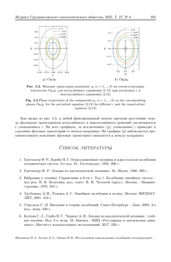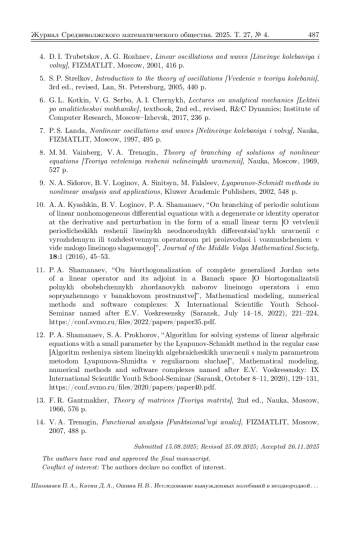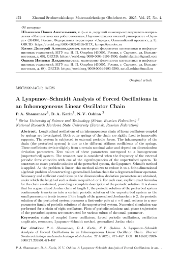 Исследуются продольные колебания неоднородной цепочки линейных осцилляторов, соединённых пружинами. Крайние пружины цепочки жёстко закреплены на неподвижных опорах. Система находится под действием внешних периодических сил. Неоднородность цепочки (возмущенная система) обусловлена тем, что коэффициенты жёсткости пружин различны. Коэффициенты жёсткости мало отклоняются от некоторого номинального значения и зависят от безразмерных параметров отклонения. Нулевое значение безразмерных параметров отклонения соответствует однородной (невозмущённой) системе. Рассматривается резонансный случай, когда частота внешней периодической силы совпадает с одной из собственных частот невозмущенной системы. Для построения точного периодического решения возмущенной системы применяется метод Ляпунова–Шмидта. Благодаря линейности задачи, этот метод позволяет свести её к конечномерной алгебраической задаче построения обобщённой жордановой цепочки для вырожденного линейного оператора. Получены необходимые и достаточные условия на безразмерные параметры отклонения, при которых длина такой цепочки равна 1 или 2. Для каждого случая выведены точные явные формулы для элементов цепочки, дающие полное описание периодического решения. Показано, что при длине обобщенной жордановой цепочки, равной 1, и стремлении малого параметра \varepsilon к нулю периодическое решение возмущенной системы непрерывно переходит в некоторое периодическое решение невозмущенной системы. Если же длина обобщенной жордановой цепочки равна 2, то периодическое решение возмущенной системы имеет полюс первого порядка в точке \varepsilon = 0, а при \varepsilon = 0 переходит в однопараметрическое семейство периодических решений невозмущенной системы. Численное моделирование проводилось на примере цепочки из восьми осцилляторов. Построены графики периодических решений и фазовых траекторий возмущенной системы при различных значениях малого параметра.