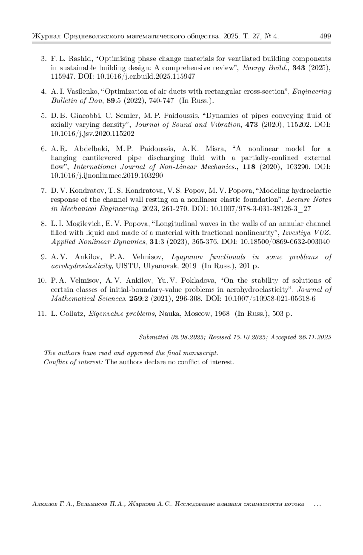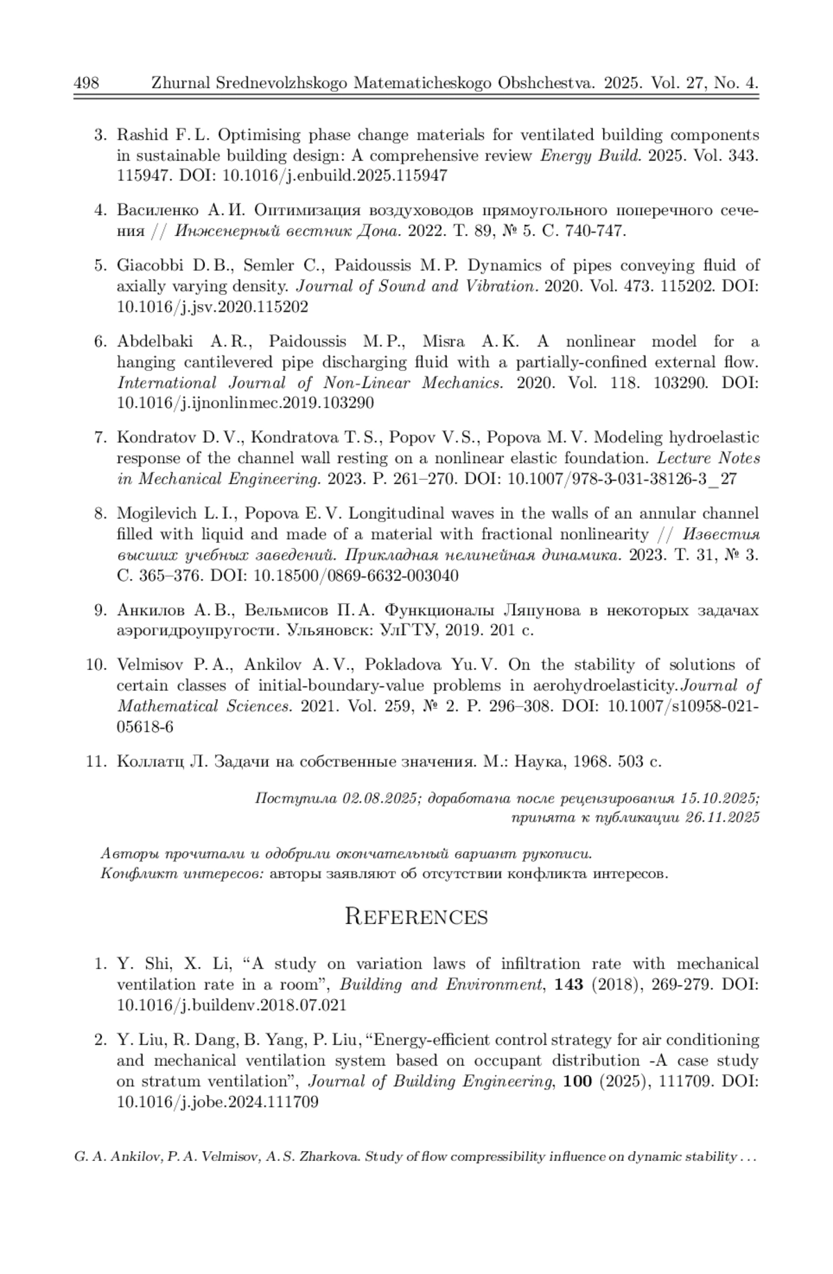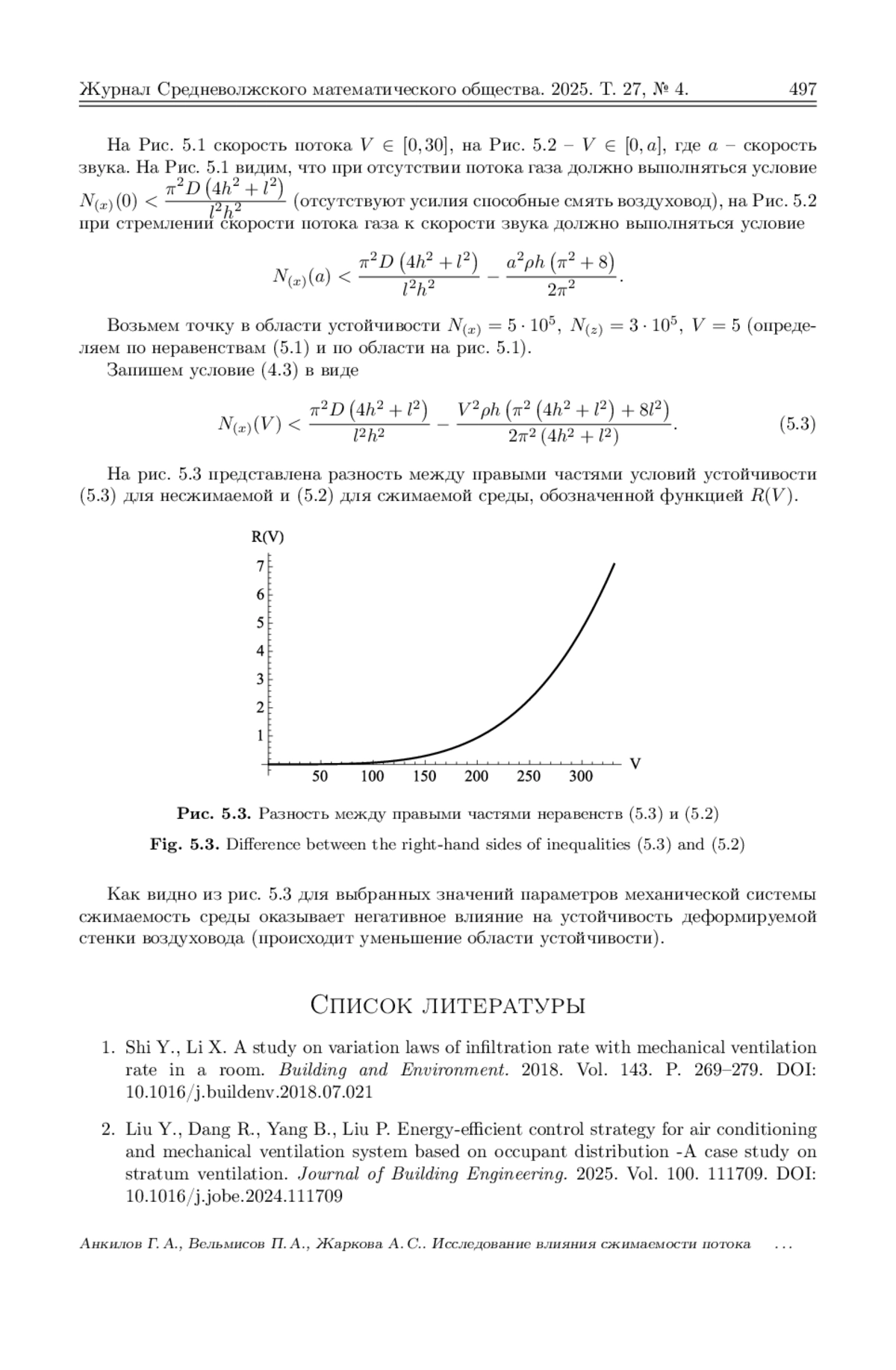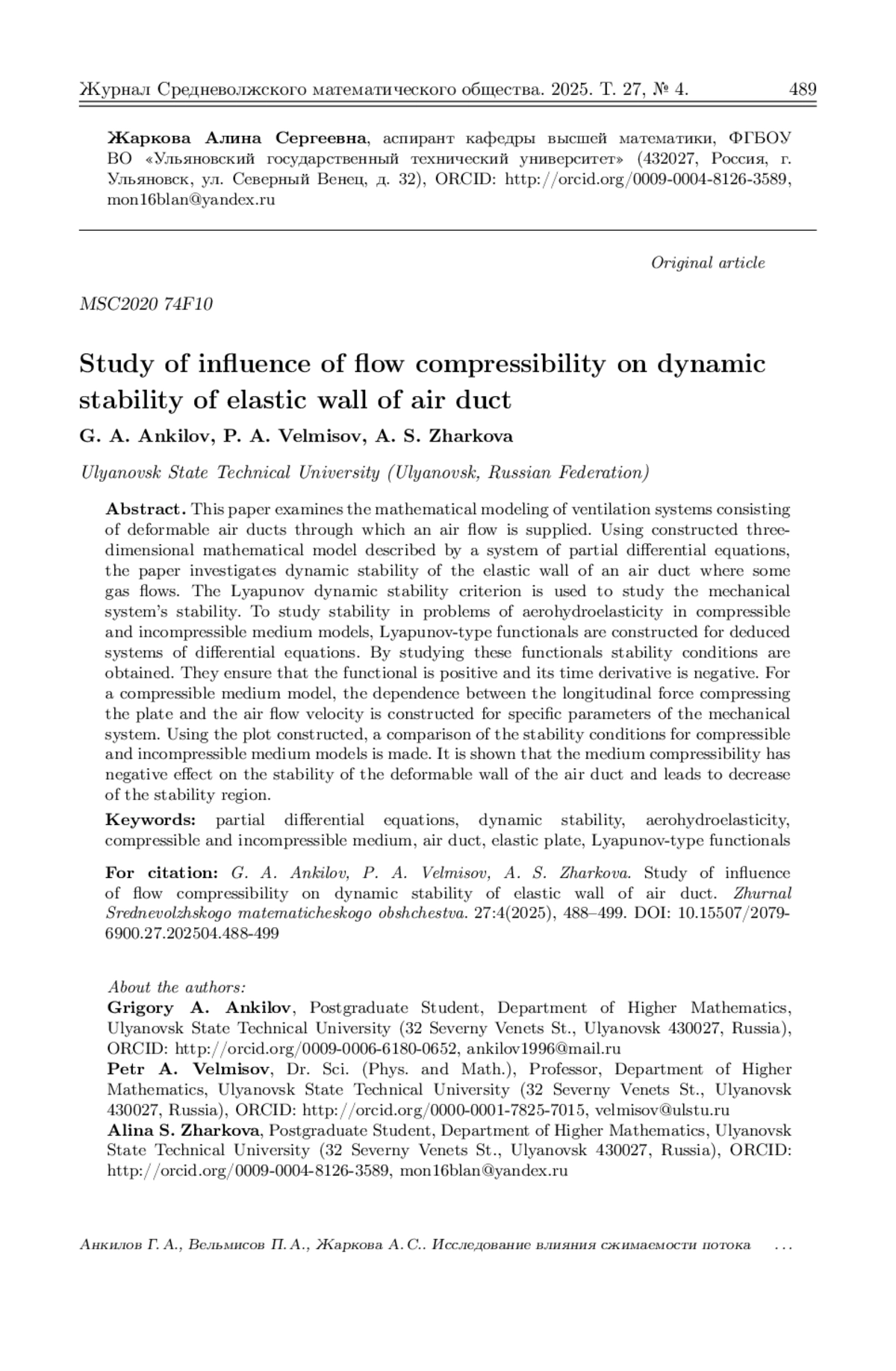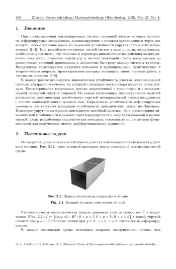 Работа посвящена математическому моделированию вентиляционных систем, состоящих из деформируемых воздуховодов, через которые подается поток воздуха. На основе построенной трехмерной математической модели, описываемой системой дифференциальных уравнений в частных производных, в работе исследуется динамическая устойчивость упругой стенки воздуховода, через который подается поток газа. В качестве критерия устойчивости используется критерий динамической устойчивости по Ляпунову, когда малым деформациям упругой стенки в начальный момент времени соответствуют и малые деформации в последующие моменты времени. Для исследования устойчивости в задачах аэрогидроупругости в моделях сжимаемой и несжимаемой среды построены функционалы типа Ляпунова для полученных систем дифференциальных уравнений. На основе исследования этих функционалов получены условия устойчивости. Эти условия обеспечивают положительность функционала и отрицательность его производной по времени. Для модели сжимаемой среды построена зависимость сжимающего пластину продольного усилия от скорости протекающего потока воздуха для конкретных параметров механической системы. С помощью построенного графика проведено сравнение условий устойчивости для моделей сжимаемой и несжимаемой среды. Показано, что сжимаемость среды оказывает негативное влияние на устойчивость деформируемой стенки воздуховода и приводит к уменьшению области устойчивости.
