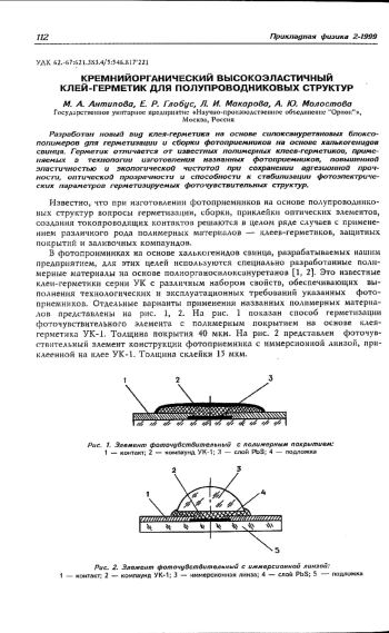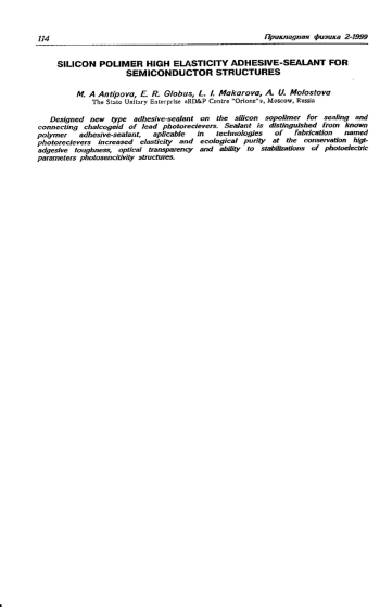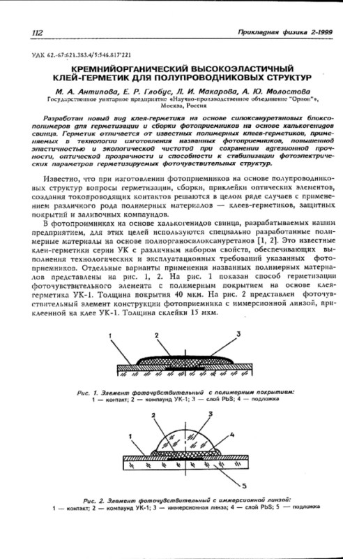 Разработан новый вид клея-герметика на основе силоксануретановых блоксополимеров для герметизации и сборки фотоприемников на основе халькогенидов свинца. Герметик отличается от известных полимерных клеев- герметиков, применяемых в технологии изготовления названных фотоприемников, повышенной эластичностью и экологической чистотой при сохранении адгезионной прочности, оптической прозрачности и способности к стабилизации фотоэлектрических параметров герметизируемых фоточувствительных структур.