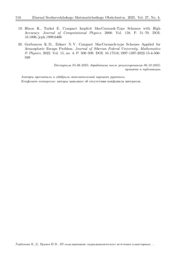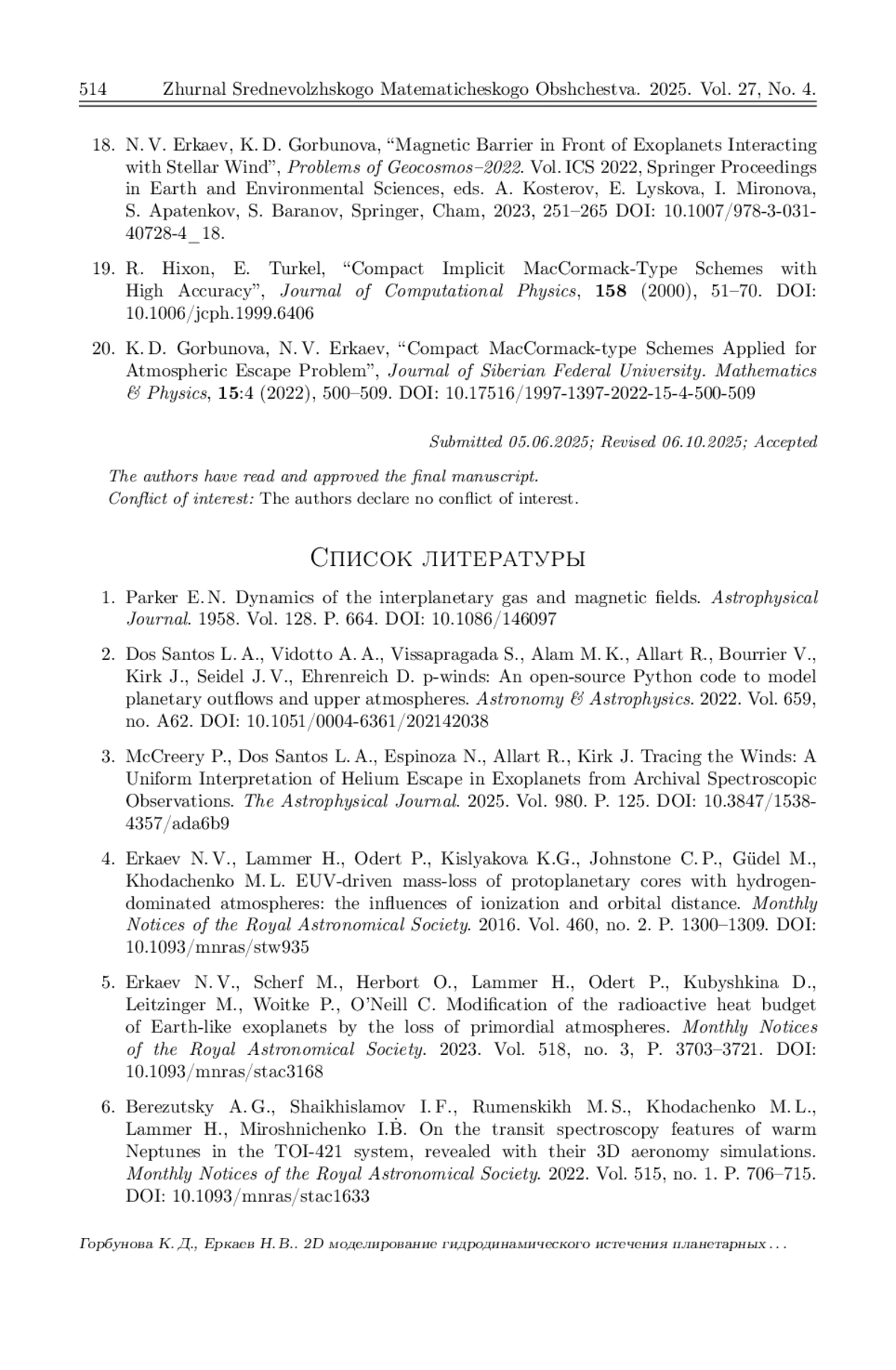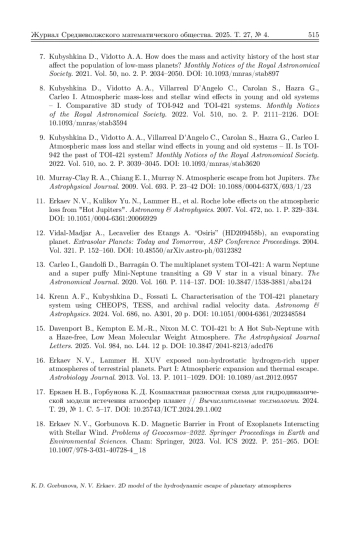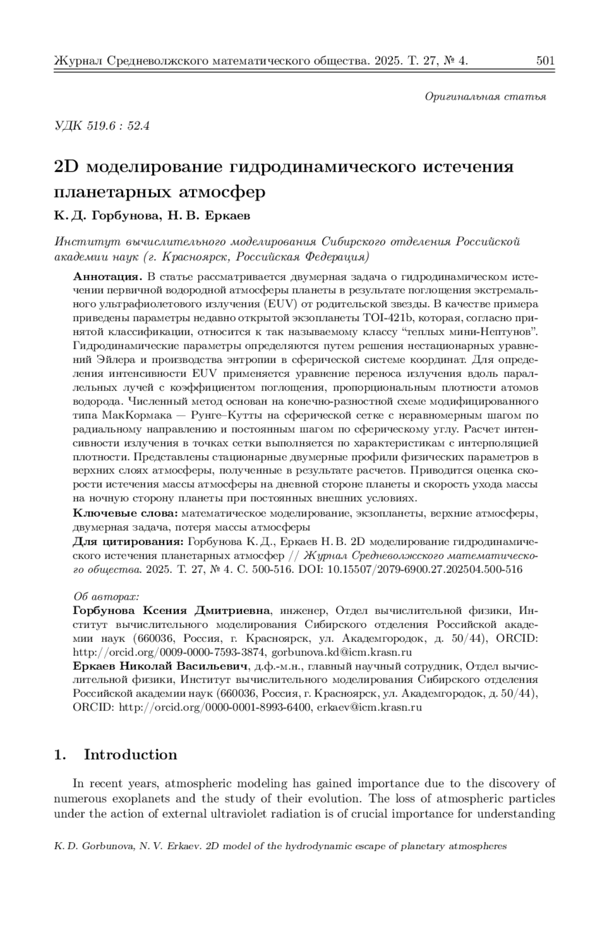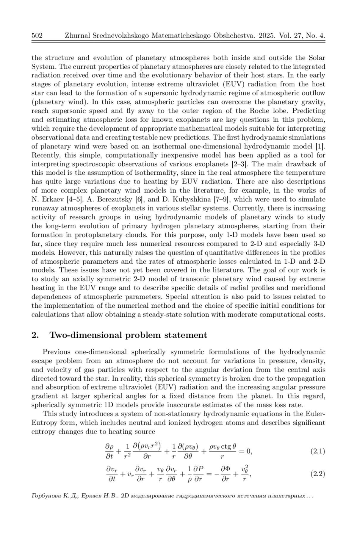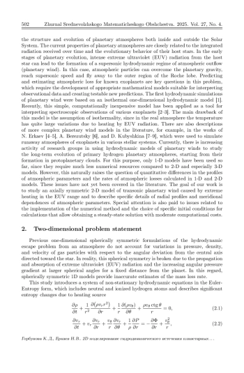В статье рассматривается двумерная задача о гидродинамическом истечении первичной водородной атмосферы планеты в результате поглощения экстремального ультрафиолетового излучения (EUV) от родительской звезды. В качестве примера приведены параметры недавно открытой экзопланеты TOI-421b, которая, согласно принятой классификации, относится к так называемому классу “теплых мини-Нептунов”. Гидродинамические параметры определяются путем решения нестационарных уравнений Эйлера и производства энтропии в сферической системе координат. Для определения интенсивности EUV применяется уравнение переноса излучения вдоль параллельных лучей с коэффициентом поглощения, пропорциональным плотности атомов водорода. Численный метод основан на конечно-разностной схеме модифицированного типа МакКормака — Рунге–Кутты на сферической сетке с неравномерным шагом по радиальному направлению и постоянным шагом по сферическому углу. Расчет интенсивности излучения в точках сетки выполняется по характеристикам с интерполяцией плотности. Представлены стационарные двумерные профили физических параметров в верхних слоях атмосферы, полученные в результате расчетов. Приводится оценка скорости истечения массы атмосферы на дневной стороне планеты и скорость ухода массы на ночную сторону планеты при постоянных внешних условиях.