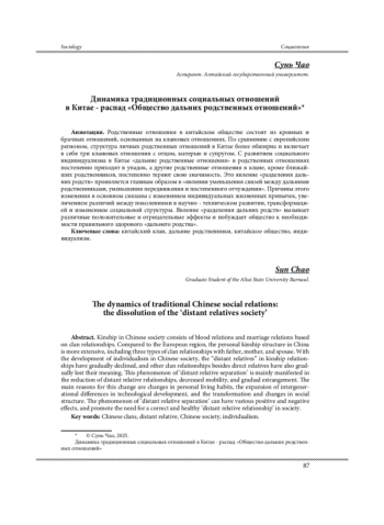 Родственные отношения в китайском обществе состоят из кровных и брачных отношений, основанных на клановых отношениях. По сравнению с европейским регионом, структура личных родственных отношений в Китае более обширна и включает в себя три клановых отношения с отцом, матерью и супругом. С развитием социального индивидуализма в Китае «дальние родственные отношения» в родственных отношениях постепенно приходят в упадок, а другие родственные отношения в клане, кроме ближайших родственников, постепенно теряют свою значимость. Это явление “разделения дальних родств” проявляется главным образом в “явлении уменьшения связей между дальними родственниками, уменьшения передвижения и постепенного отчуждения”. Причины этого изменения в основном связаны с изменением индивидуальных жизненных привычек, увеличением различий между поколениями в научно - техническом развитии, трансформацией и изменением социальной структуры. Явление “разделения дальних родств” вызывает различные положительные и отрицательные эффекты и побуждает общество к необходимости правильного здорового “дальнего родства”.
