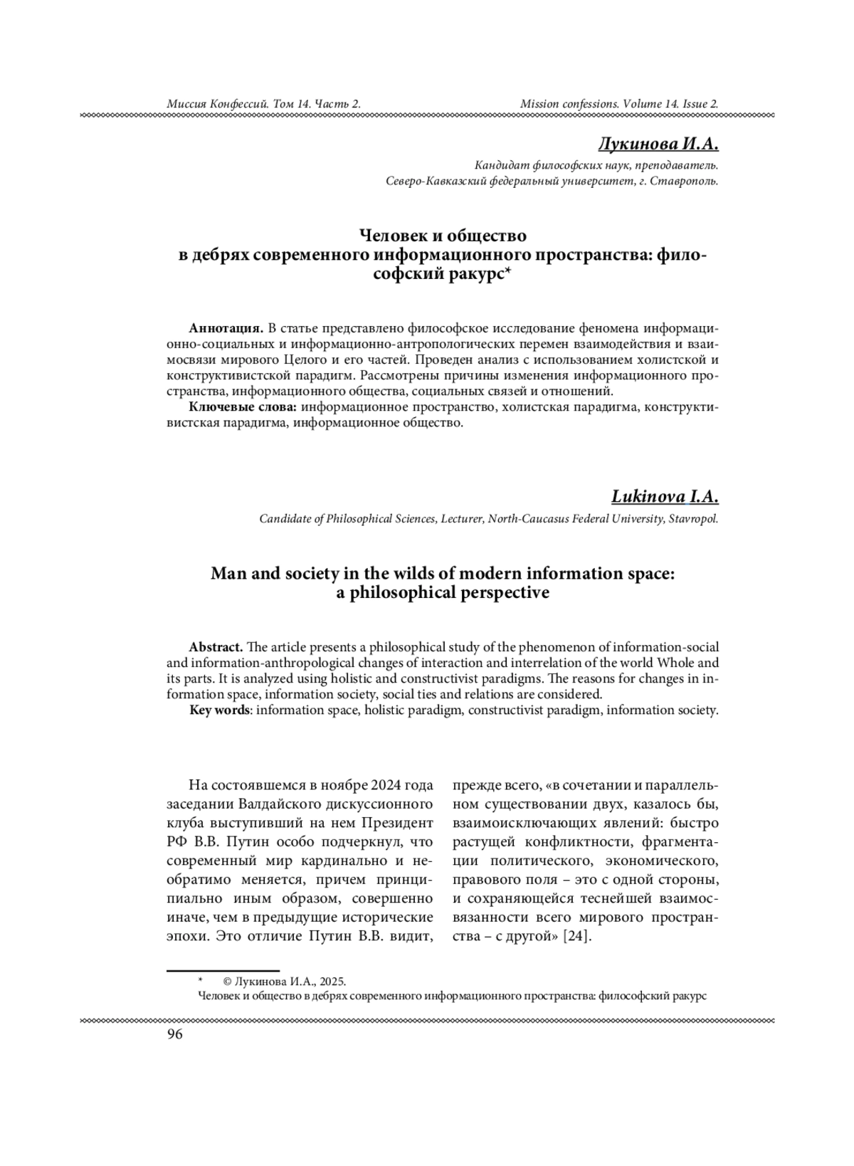 В статье представлено философское исследование феномена информационно-социальных и информационно-антропологических перемен взаимодействия и взаимосвязи мирового Целого и его частей. Проведен анализ с использованием холистской и конструктивистской парадигм. Рассмотрены причины изменения информационного пространства, информационного общества, социальных связей и отношений.