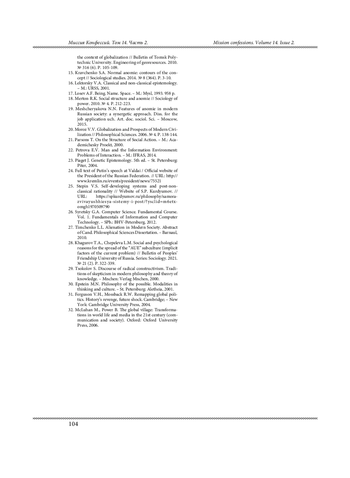 19. Мещерякова Н.Н. Особенности аномии в современном российском обществе: синергетический подход. Дисс. на соиск. уч. ст. докт. социол. наук. - Москва, 2015. EDN: WGAHVN