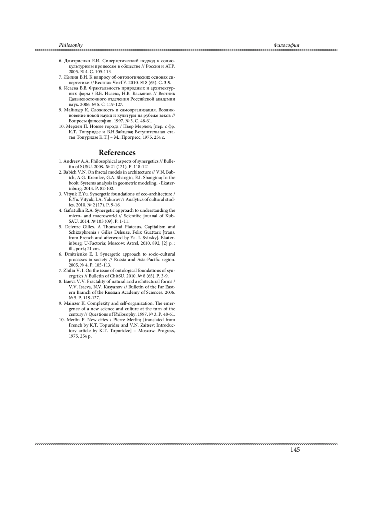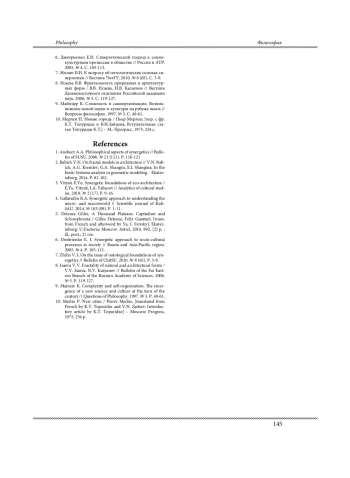 1. Андреев А.А. Философские аспекты синергетики // Вестник ЮУрГУ. 2008. № 21 (121). С. 118-121.