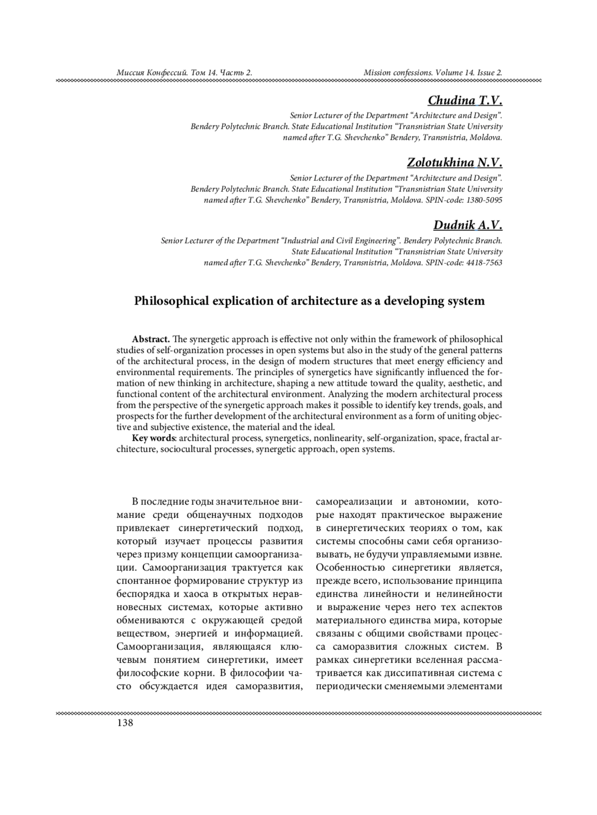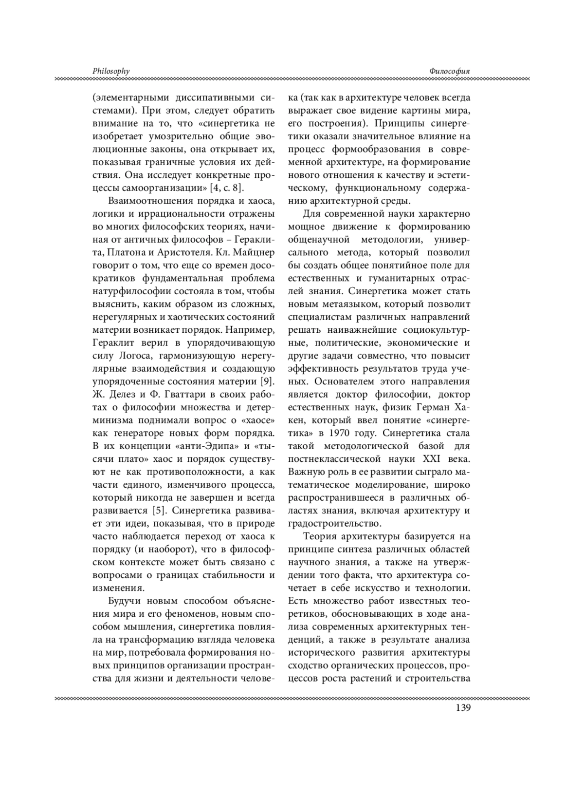 Синергетический подход эффективен не только в рамках философских исследований процессов самоорганизации в открытых системах, но и при изучении общих закономерностей архитектурного процесса, в проектировании современных объектов, отвечающих требованиям энергоэффективности и экологичности. Принципы синергетики оказали значительное влияние на формирование нового мышления в архитектуре, нового отношения к качеству и эстетическому, функциональному содержанию архитектурной среды. Анализ современного архитектурного процесса с позиций синергетического подхода позволяет выявить основные тенденции, целевые установки и перспективы дальнейшего развития архитектурной среды, как формы объединения объективного и субъективного бытия, материального и идеального.