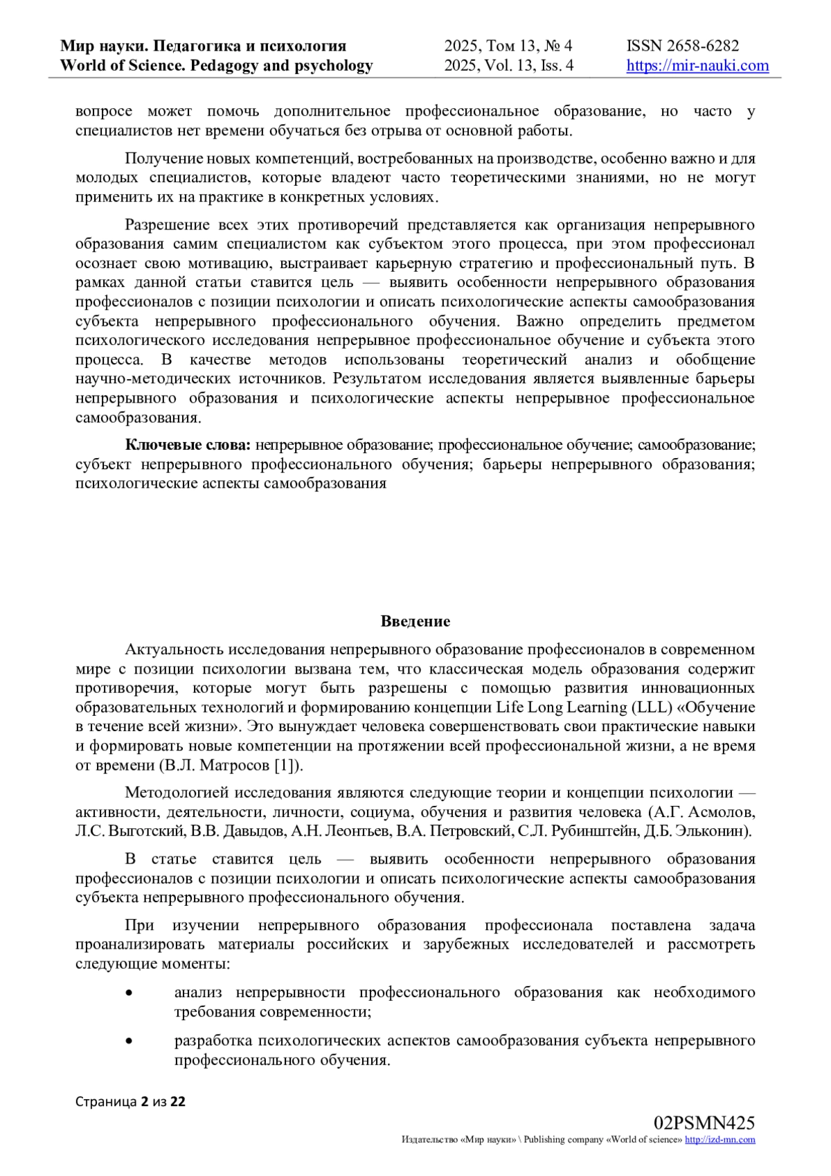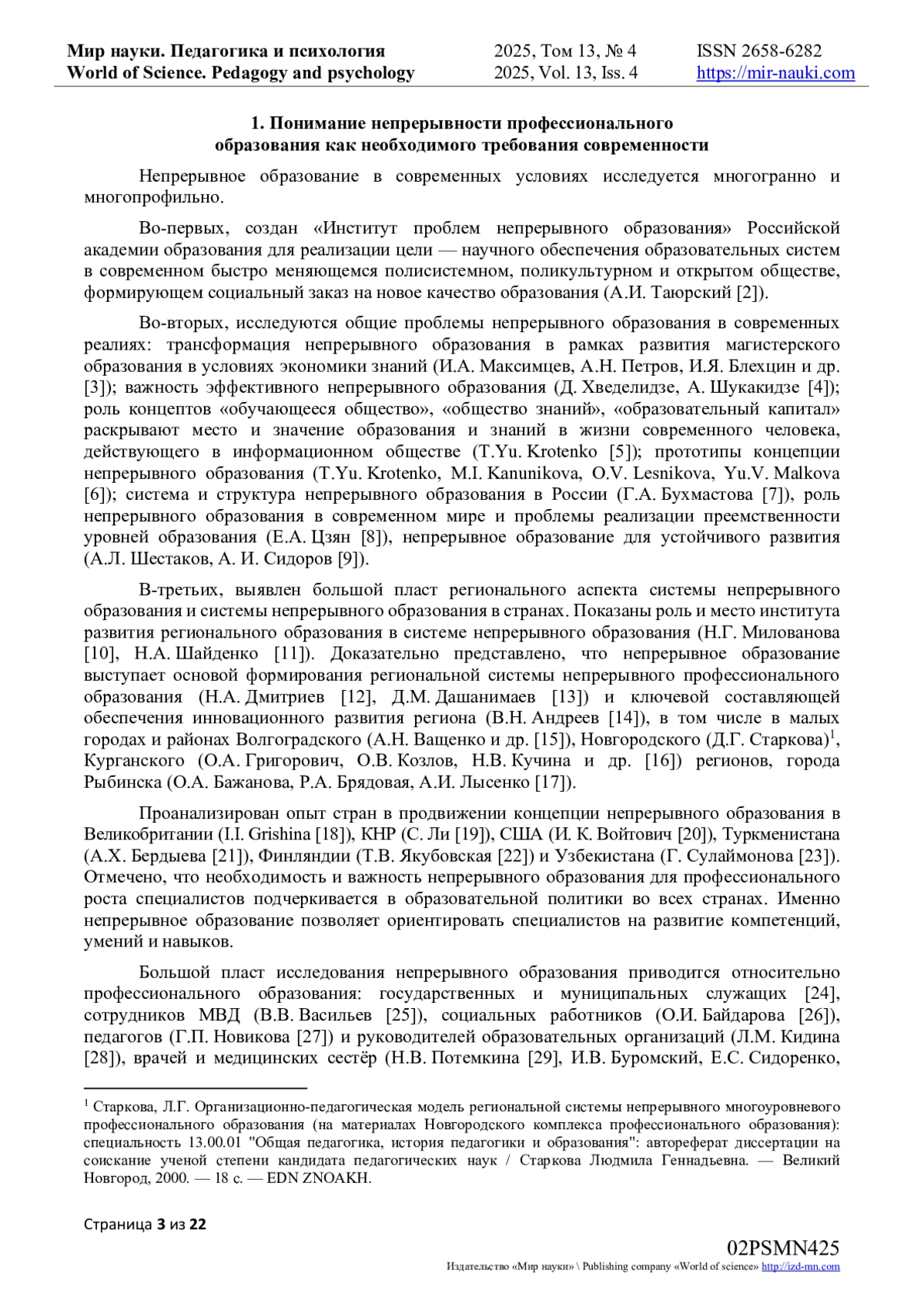 33. Колесникова, Г.Г. Образование на протяжении всей жизни или поговорим о непрерывном профессиональном образовании / Г.Г. Колесникова // Педагогика и психология: научные приоритеты учёных: сборник научных трудов по итогам международной научно-практической конференции, Пермь, 25 ноября 2017 года. Том Выпуск 2. - Пермь: Федеральный центр науки и образования “Эвенсис”, 2017. - С. 18-20. EDN: YVYHOP