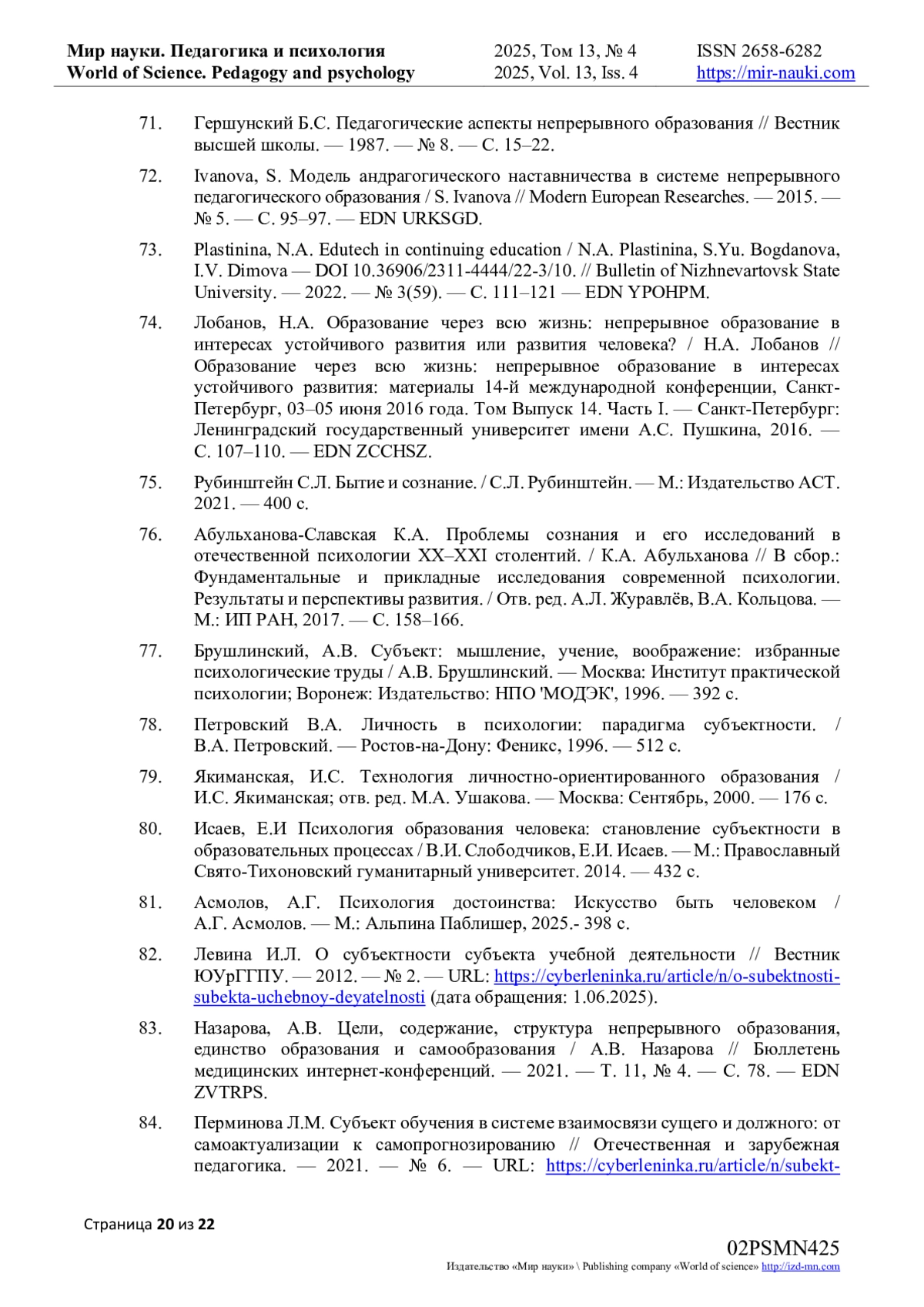 84. Перминова Л.М. Субъект обучения в системе взаимосвязи сущего и должного: от самоактуализации к самопрогнозированию // Отечественная и зарубежная педагогика. - 2021. - № 6. - URL: https://cyberleninka.ru/article/n/subekt-obucheniya-v-sisteme-vzaimosvyazi-suschego-i-dolzhnogo-ot-samoaktualizatsii-k-samoprognozirovaniyu (дата обращения: 21.06.2025). EDN: MOPPNL