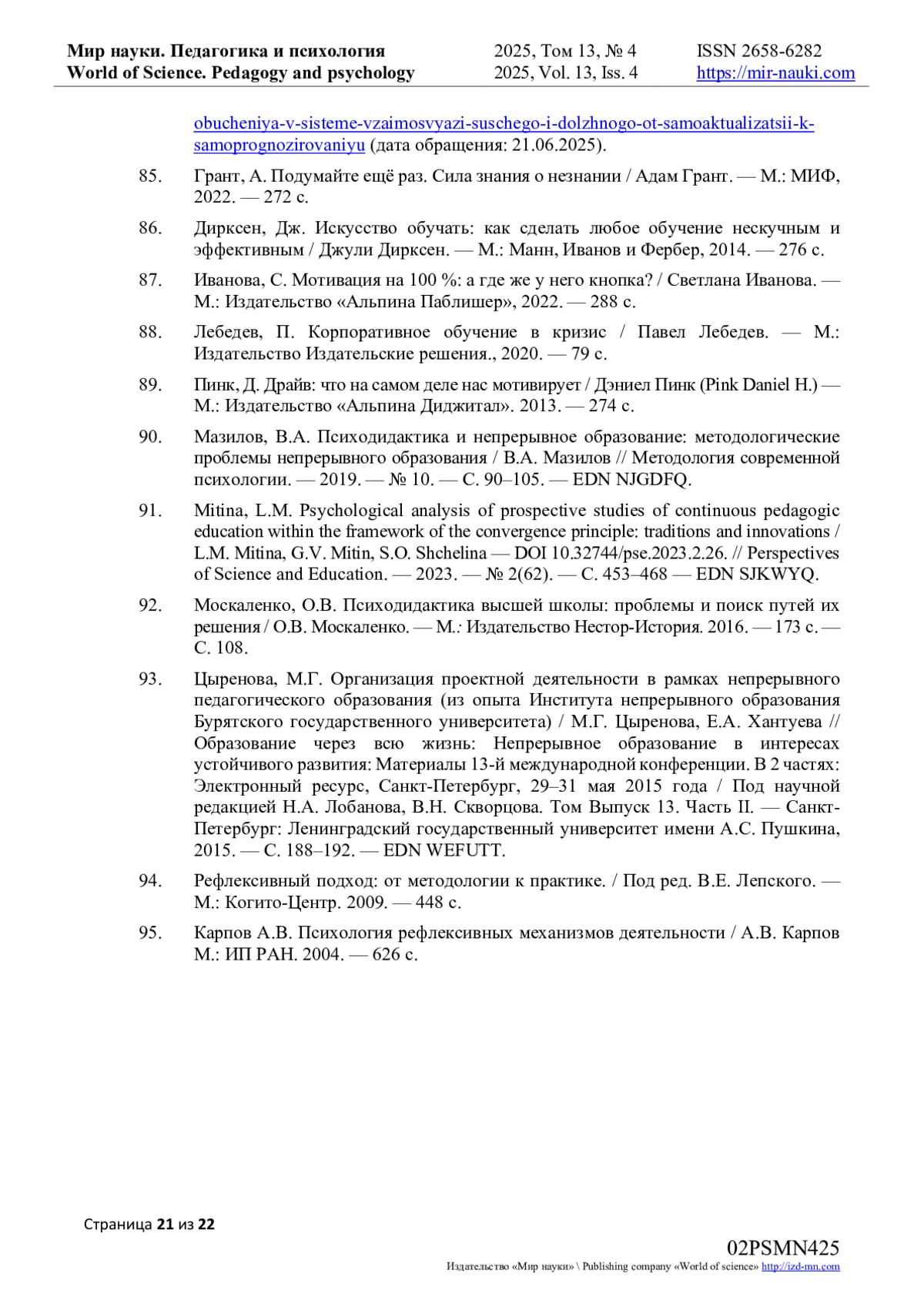 91. Mitina, L.M. Psychological analysis of prospective studies of continuous pedagogic education within the framework of the convergence principle: traditions and innovations / L.M. Mitina, G.V. Mitin, S.O. Shchelina // Perspectives of Science and Education. - 2023. - № 2(62). - C. 453-468. DOI: 10.32744/pse.2023.2.26 EDN: SJKWYQ