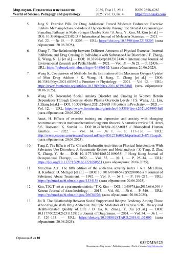 4. Zhao Q. Effects of chronic aerobic exercise on attentional bias among women with methamphetamine addiction / Q. Zhao, J. Liu, C. Zhou [et al.] - // Heliyon. - 2024. - Vol. 10. - № 9. - P. e29847. - URL: (дата обращения: 20.06.2025). DOI: 10.1016/j.heliyon.2024.e29847 EDN: HDOITQ