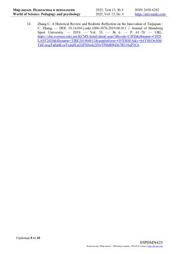 14. Zhang C. A Historical Review and Realistic Reflection on the Innovation of Taijiquan / C. Zhang, - // Journal of Shandong Sport University. - 2019. - Vol. 35. - № 6. - P. 61-70. - URL: https://chn.oversea.cnki.net/KCMS/detail/detail.aspx?dbcode=CJFD&dbname=CJFDLAST2020&filename=TIRE201906012&uniplatform=OVERSEA&v=h4Y9EOwJtMTdZ-nogTqEpdLsaYcpq9Lp2iiPX6mk2Z9zTPkhB9G0n7R310qP3Cit. DOI: 10.14104/j.cnki.1006-2076.2019.06.011