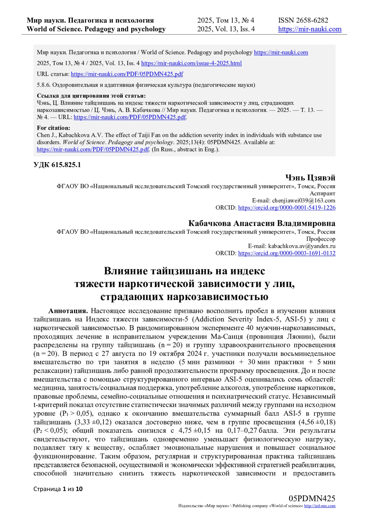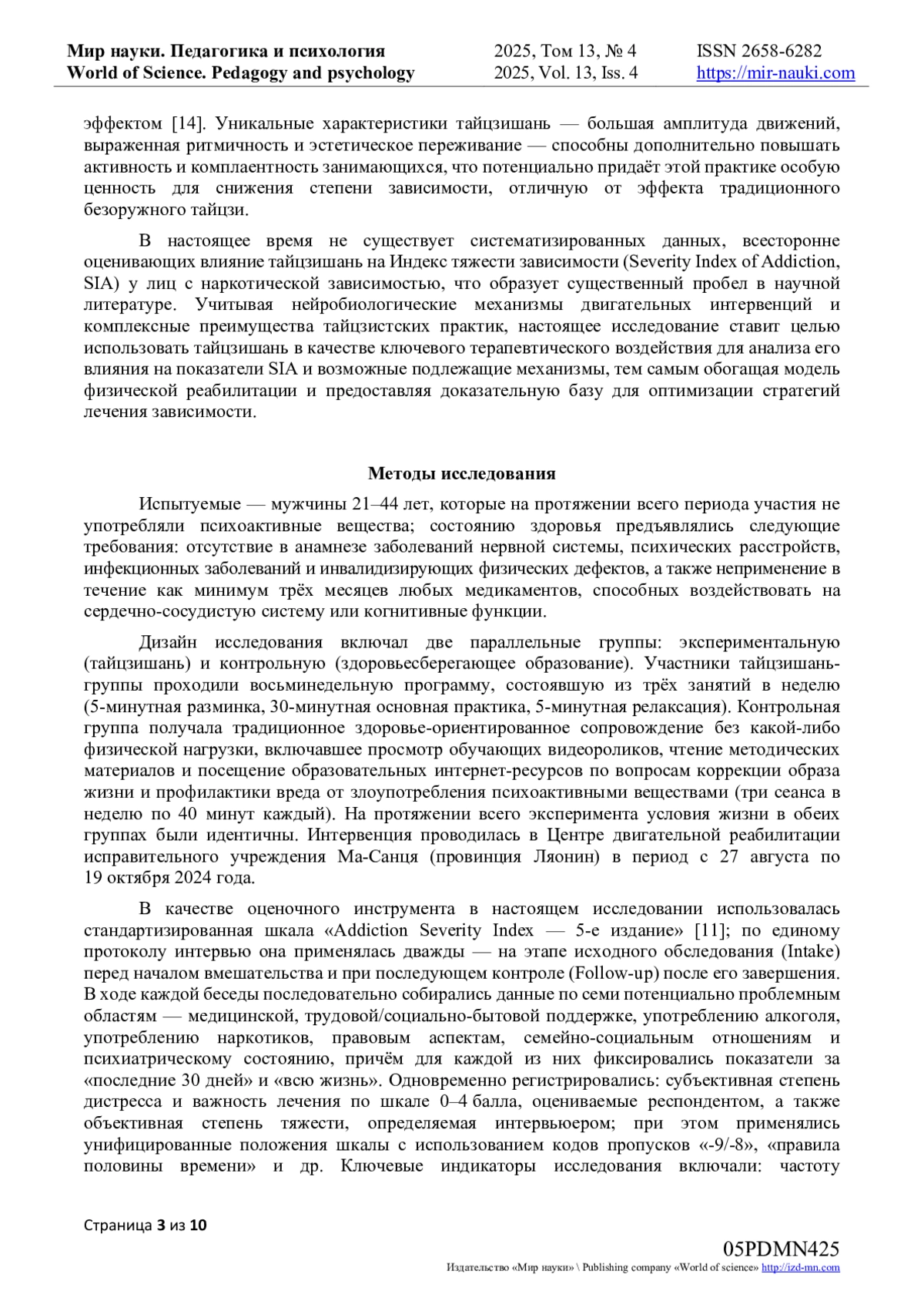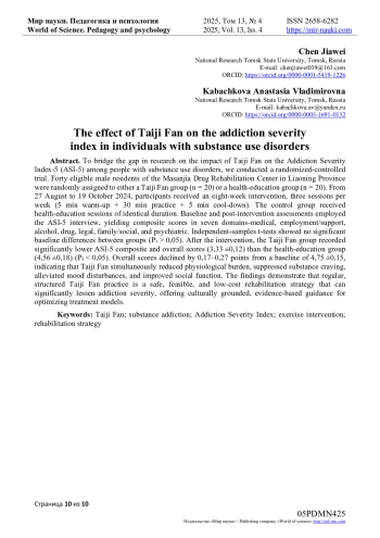 Настоящее исследование призвано восполнить пробел в изучении влияния тайцзишань на Индекс тяжести зависимости-5 (Addiction Severity Index-5, ASI-5) у лиц с наркотической зависимостью. В рандомизированном эксперименте 40 мужчин-наркозависимых, проходящих лечение в исправительном учреждении Ма-Санця (провинция Ляонин), были распределены на группу тайцзишань (n = 20) и группу здравоохранительного просвещения (n = 20). В период с 27 августа по 19 октября 2024 г. участники получали восьминедельное вмешательство по три занятия в неделю (5 мин разминки + 30 мин практики + 5 мин релаксации) тайцзишань либо равной продолжительности программу просвещения. До и после вмешательства с помощью структурированного интервью ASI-5 оценивались семь областей: медицина, занятость/социальная поддержка, употребление алкоголя, употребление наркотиков, правовые проблемы, семейно-социальные отношения и психиатрический статус. Независимый t-критерий показал отсутствие статистически значимых различий между группами на исходном уровне (P₁ > 0,05), однако к окончанию вмешательства суммарный балл ASI-5 в группе тайцзишань (3,33 ±0,12) оказался достоверно ниже, чем в группе просвещения (4,56 ±0,18) (P₂ < 0,05); общий показатель снизился с 4,75 ±0,15 на 0,17-0,27 балла. Эти результаты свидетельствуют, что тайцзишань одновременно уменьшает физиологическую нагрузку, подавляет тягу к веществу, ослабляет эмоциональные нарушения и повышает социальное функционирование. Таким образом, регулярная и структурированная практика тайцзишань представляется безопасной, осуществимой и экономически эффективной стратегией реабилитации, способной значительно снизить тяжесть наркотической зависимости и предоставить культурно-специфичное доказательное основание для совершенствования моделей лечения.