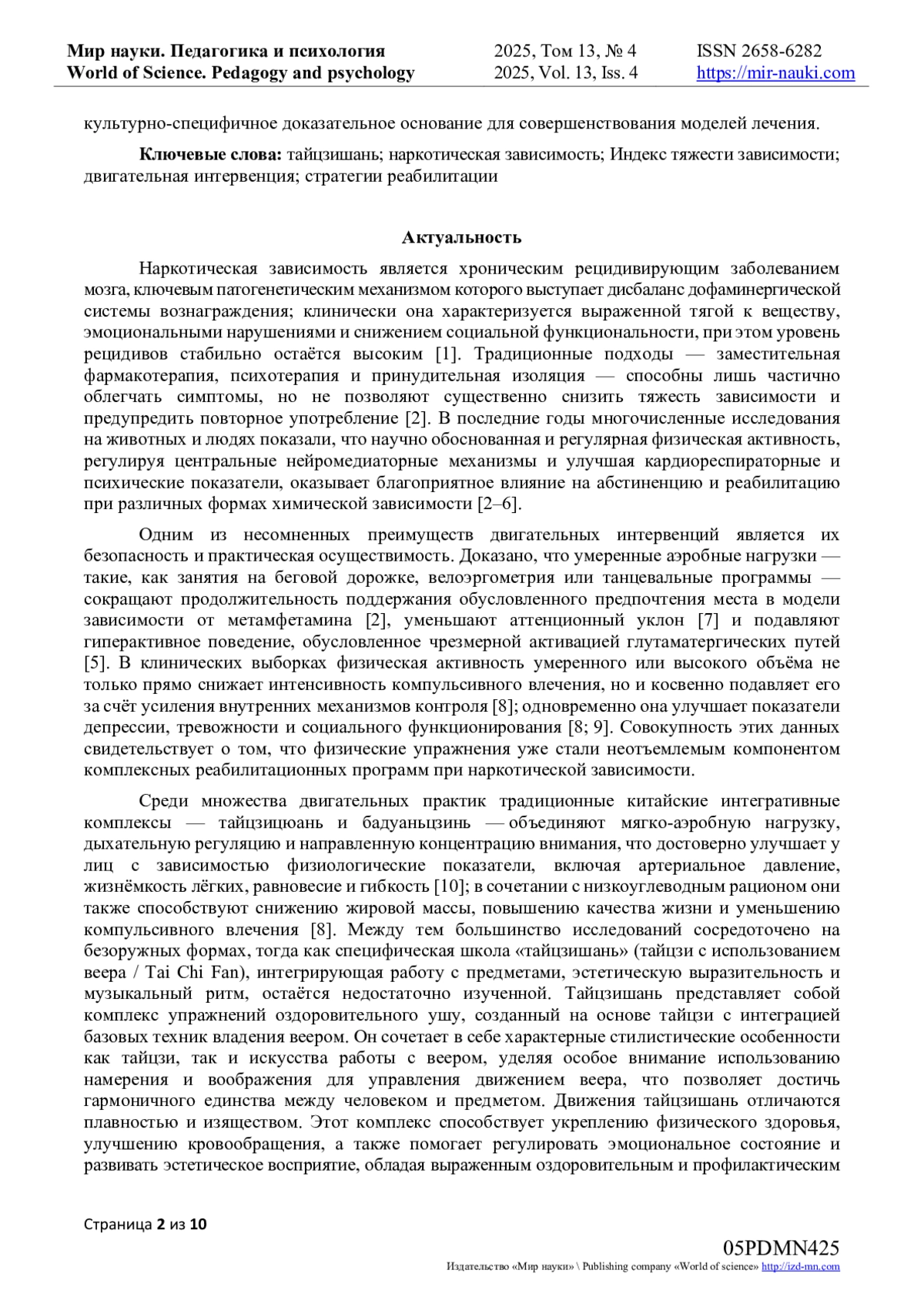 10. Tang Z. The Effects of Tai Chi and Baduanjin Activities on Physical Interventions With Substance Use Disorders: A Systematic Review and Meta-analysis / Z. Tang, Z. Zhu, X. Zhang, Y. He - // Hong Kong Journal of Occupational Therapy. - 2022. - Vol. 35. - № 1. - P. 25-34. - (дата обращения: 20.06.2025). DOI: 10.1177/15691861221090551 EDN: HFDFJJ