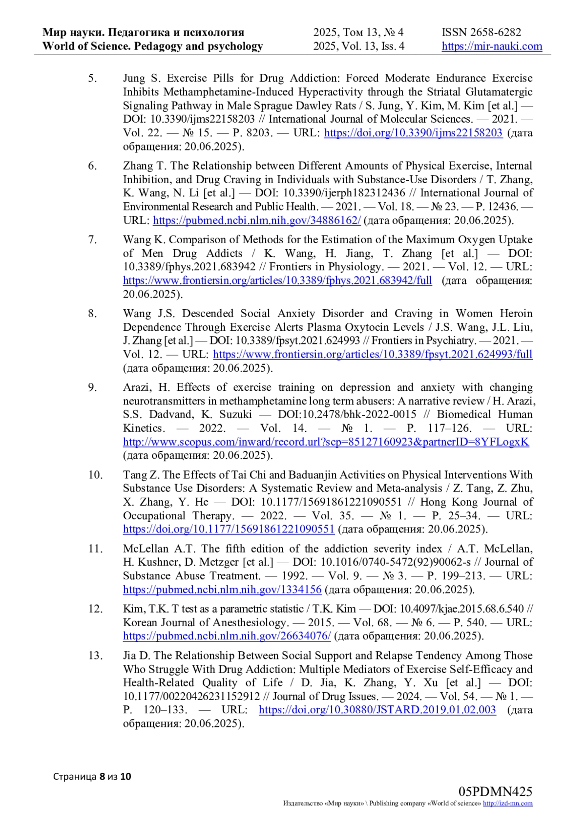 5. Jung S. Exercise Pills for Drug Addiction: Forced Moderate Endurance Exercise Inhibits Methamphetamine-Induced Hyperactivity through the Striatal Glutamatergic Signaling Pathway in Male Sprague Dawley Rats / S. Jung, Y. Kim, M. Kim [et al.] - // International Journal of Molecular Sciences. - 2021. - Vol. 22. - № 15. - P. 8203. - URL: (дата обращения: 20.06.2025). DOI: 10.3390/ijms22158203 EDN: RBXPBZ