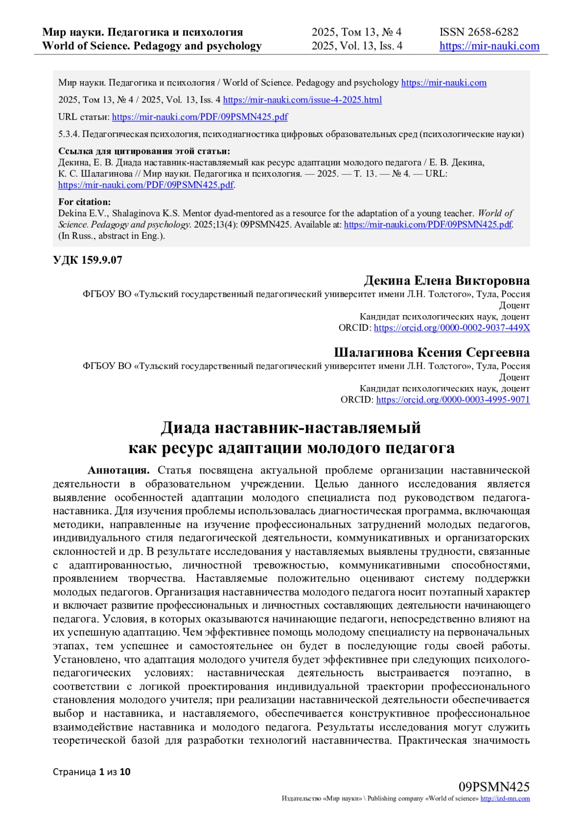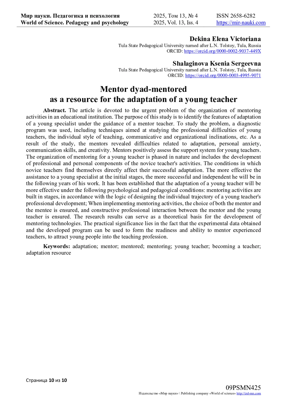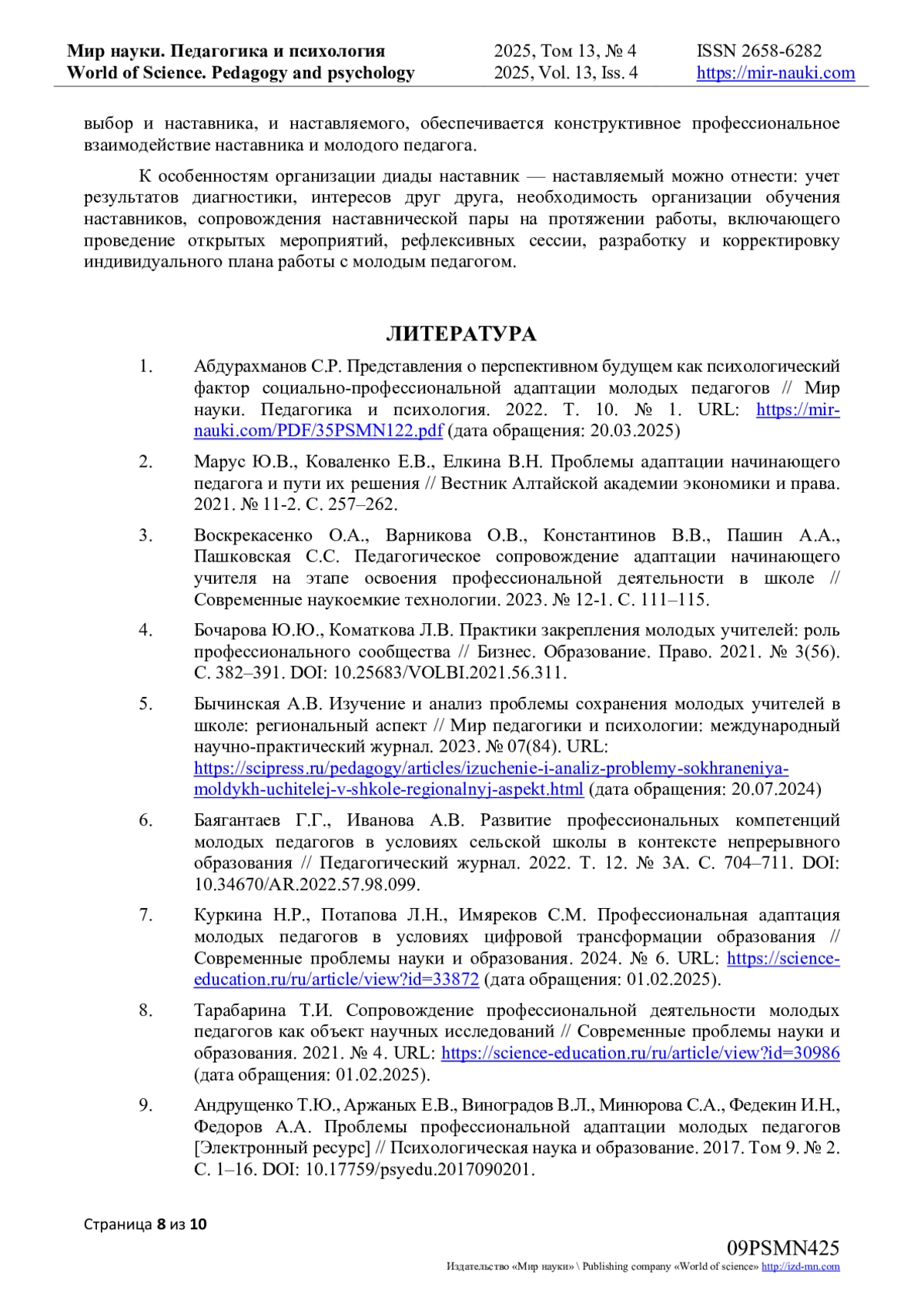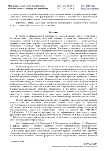 1. Абдурахманов С.Р. Представления о перспективном будущем как психологический фактор социально-профессиональной адаптации молодых педагогов // Мир науки. Педагогика и психология. 2022. Т. 10. № 1. URL: https://mir-nauki.com/PDF/35PSMN122.pdf (дата обращения: 20.03.2025). EDN: KNIEZX
