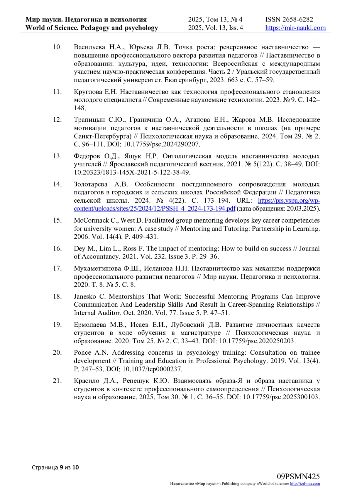 17. Мухаметзянова Ф.Ш., Исланова Н.Н. Наставничество как механизм поддержки профессионального развития педагогов // Мир науки. Педагогика и психология. 2020. Т. 8. № 5. С. 8. EDN: FVMREF