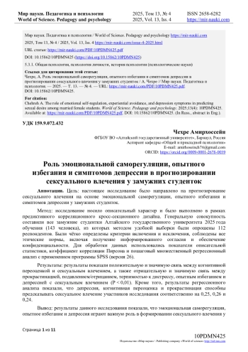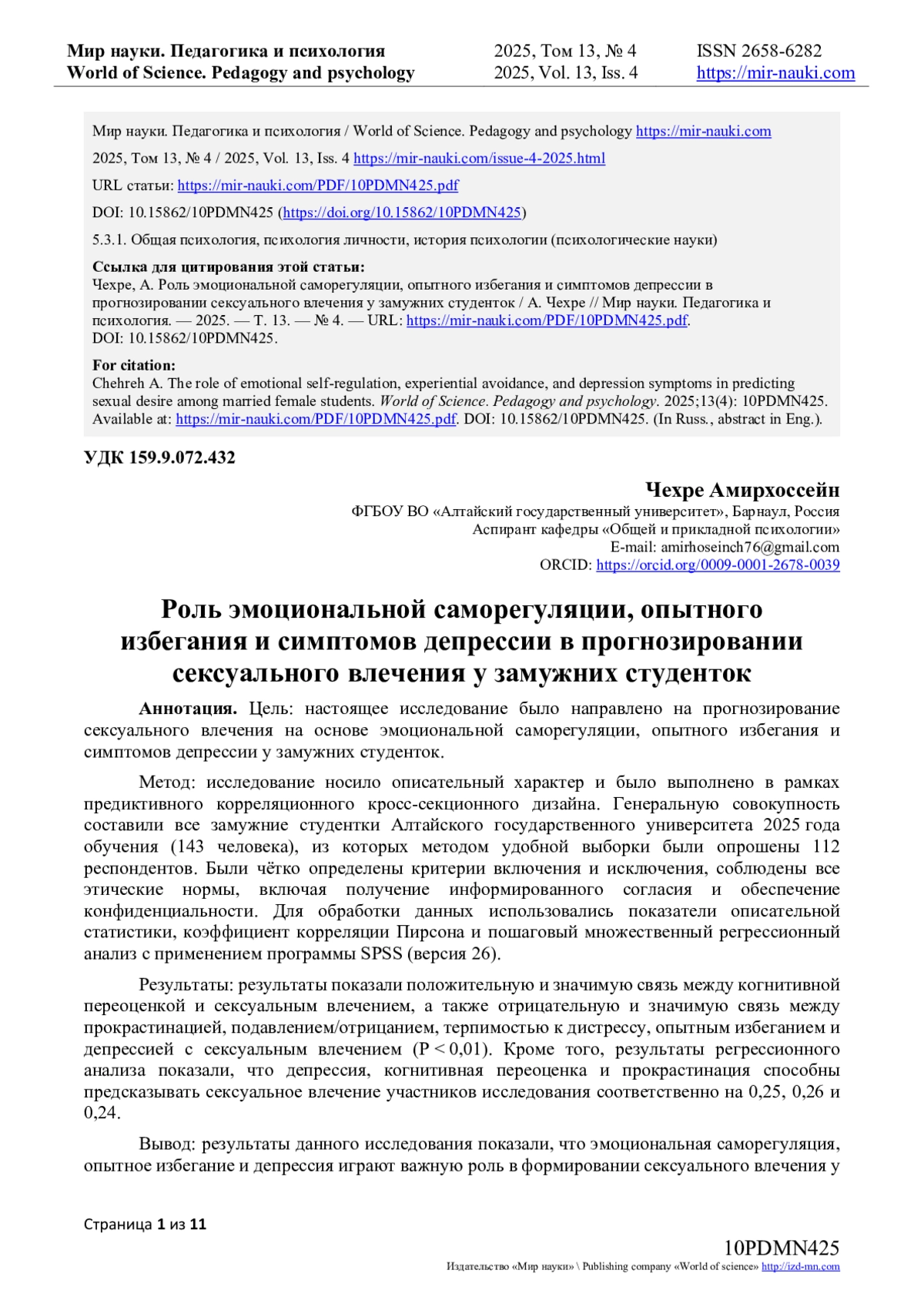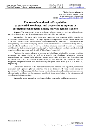 Цель: настоящее исследование было направлено на прогнозирование сексуального влечения на основе эмоциональной саморегуляции, опытного избегания и симптомов депрессии у замужних студенток.