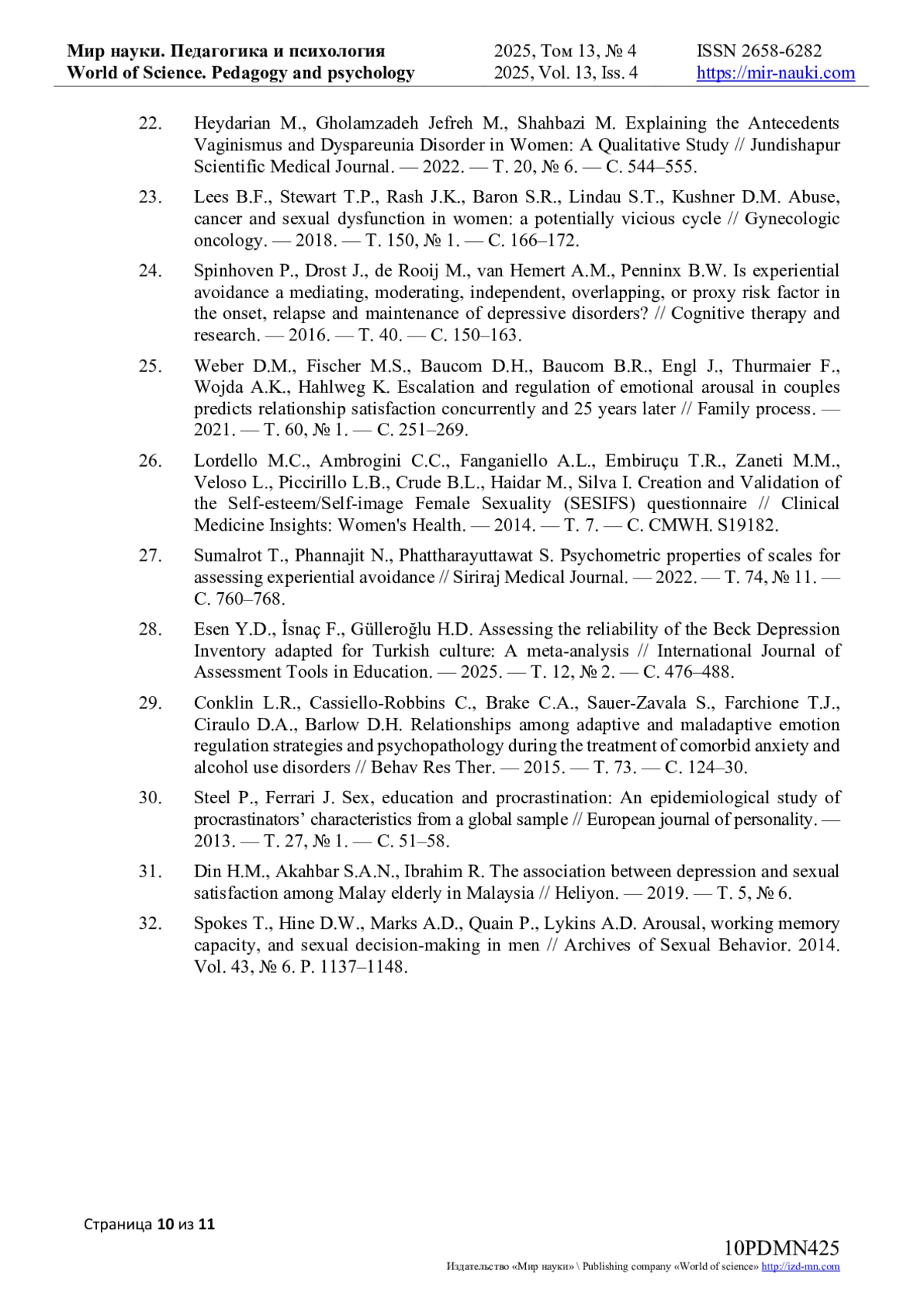 16. Mojdeh F., Mohamadi S.Z. The relationship between depression and sexual function index among married women // Avicenna Journal of Nursing and Midwifery Care. - 2013. - T. 21, № 1. - C. 41-51.