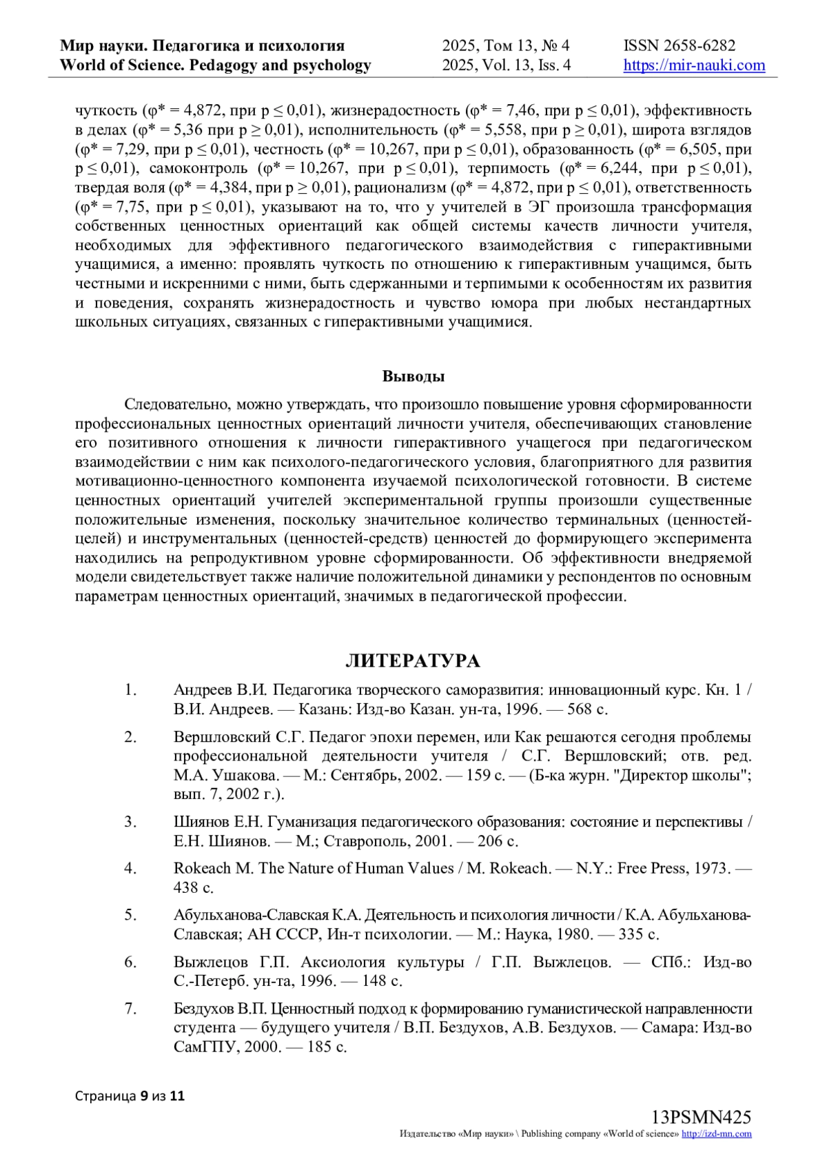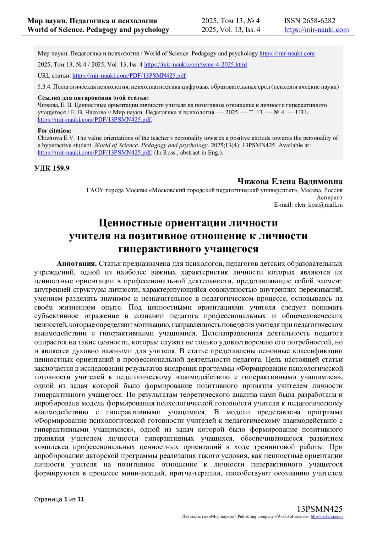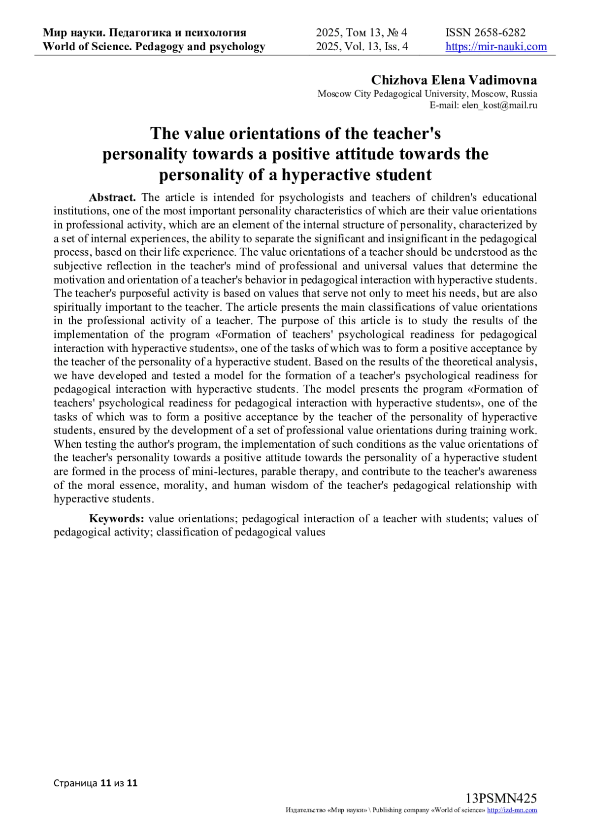 Цель настоящей статьи заключается в исследовании результатов внедрения программы «Формирование психологической готовности учителей к педагогическому взаимодействию с гиперактивными учащимися», одной из задач которой было формирование позитивного принятия учителем личности гиперактивного учащегося. По результатам теоретического анализа нами была разработана и апробирована модель формирования психологической готовности учителя к педагогическому взаимодействию с гиперактивными учащимися. В модели представлена программа «Формирование психологической готовности учителей к педагогическому взаимодействию с гиперактивными учащимися», одной из задач которой было формирование позитивного принятия учителем личности гиперактивных учащихся, обеспечивающееся развитием комплекса профессиональных ценностных ориентаций в ходе тренинговой работы. При апробировании авторской программы реализация такого условия, как ценностные ориентации личности учителя на позитивное отношение к личности гиперактивного учащегося формируются в процессе мини-лекций, притча-терапии, способствуют осознанию учителем нравственной сути, морали, человеческой мудрости педагогических взаимоотношений учителя с гиперактивными учащимися.