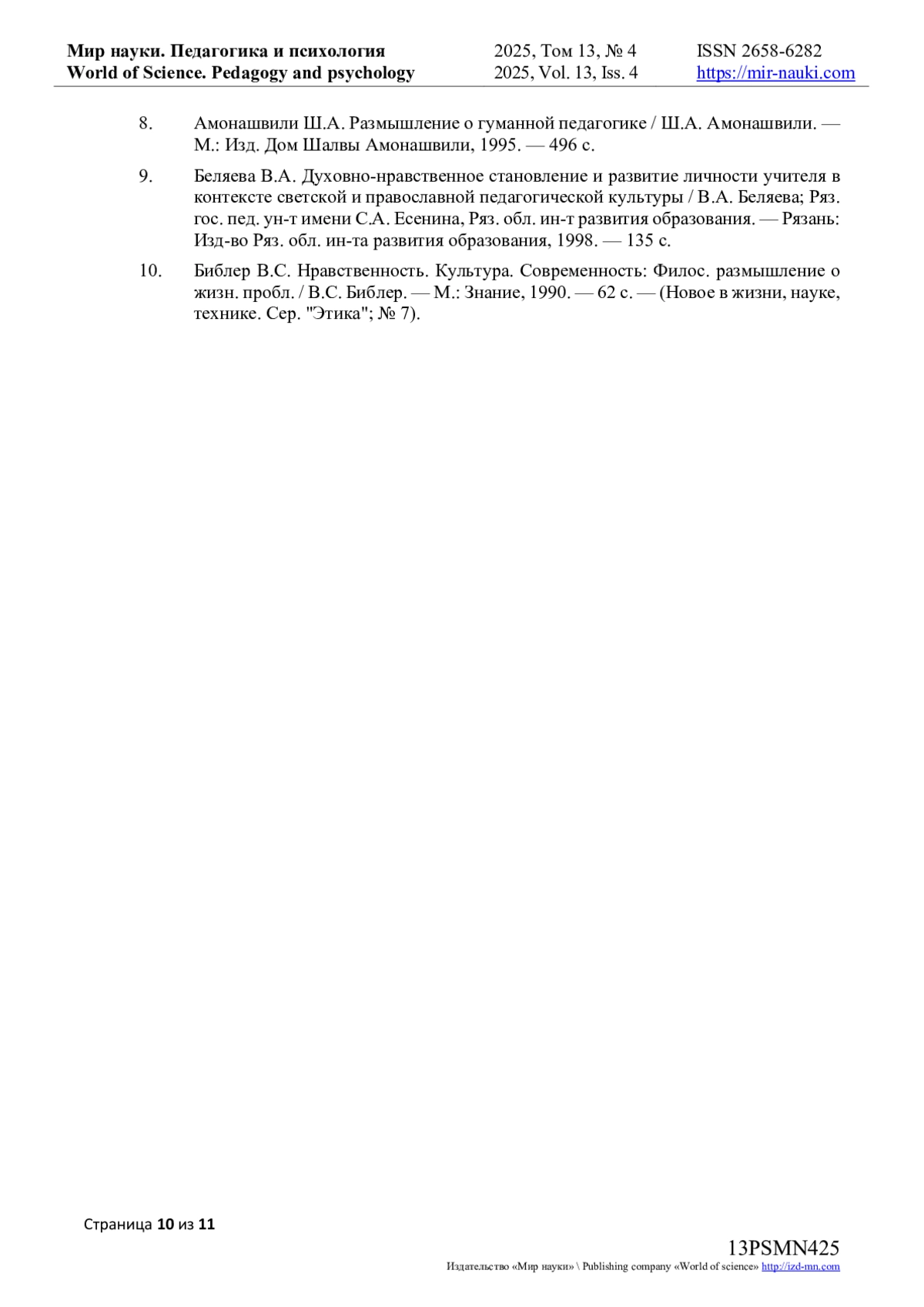 7. Бездухов В.П. Ценностный подход к формированию гуманистической направленности студента - будущего учителя / В.П. Бездухов, А.В. Бездухов. - Самара: Изд-во СамГПУ, 2000. - 185 с. EDN: SCWGXX