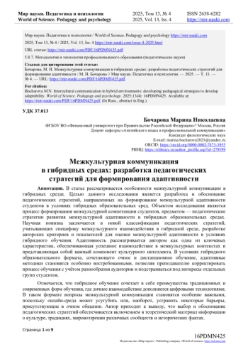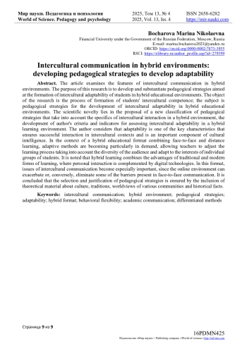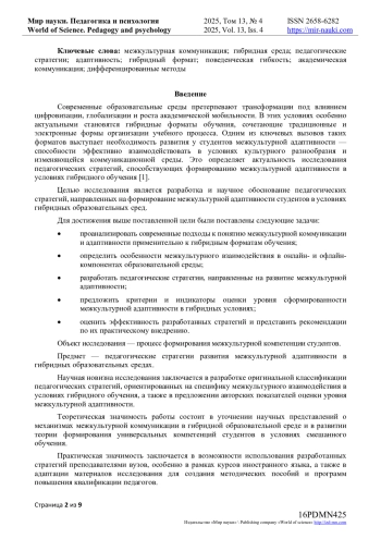 Объектом исследования является процесс формирования межкультурной компетенции студентов, предметом - педагогические стратегии развития межкультурной адаптивности в гибридных образовательных средах.