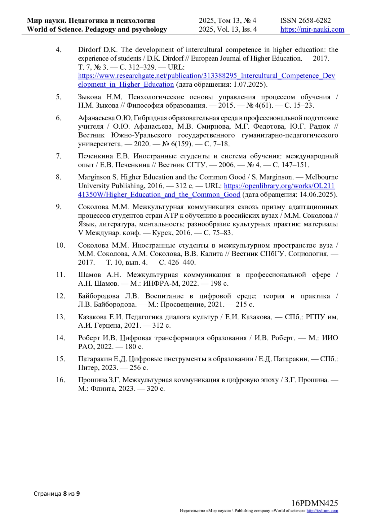4. Dirdorf D.K. The development of intercultural competence in higher education: the experience of students / D.K. Dirdorf // European Journal of Higher Education. - 2017. - Т. 7, № 3. - С. 312-329. - URL: https://www.researchgate.net/publication/313388295_Intercultural_Competence_Development_in_Higher_Education (дата обращения: 1.07.2025).