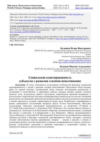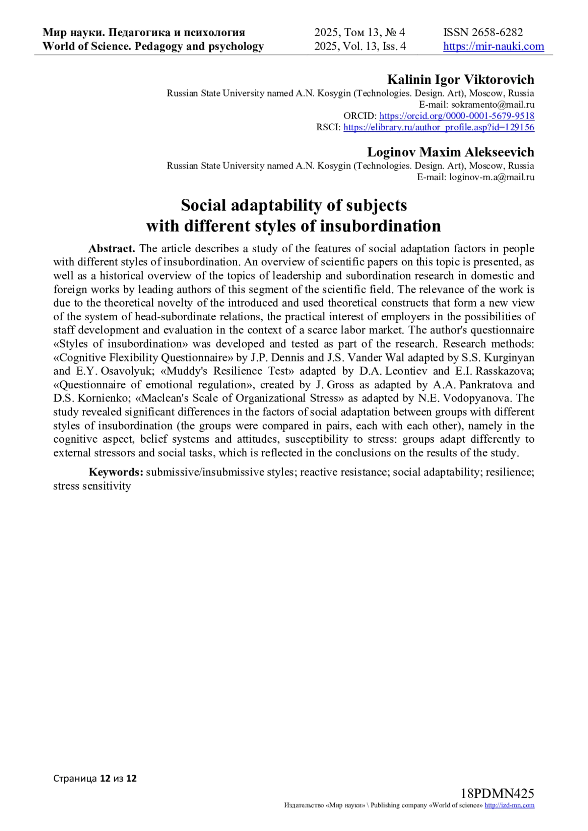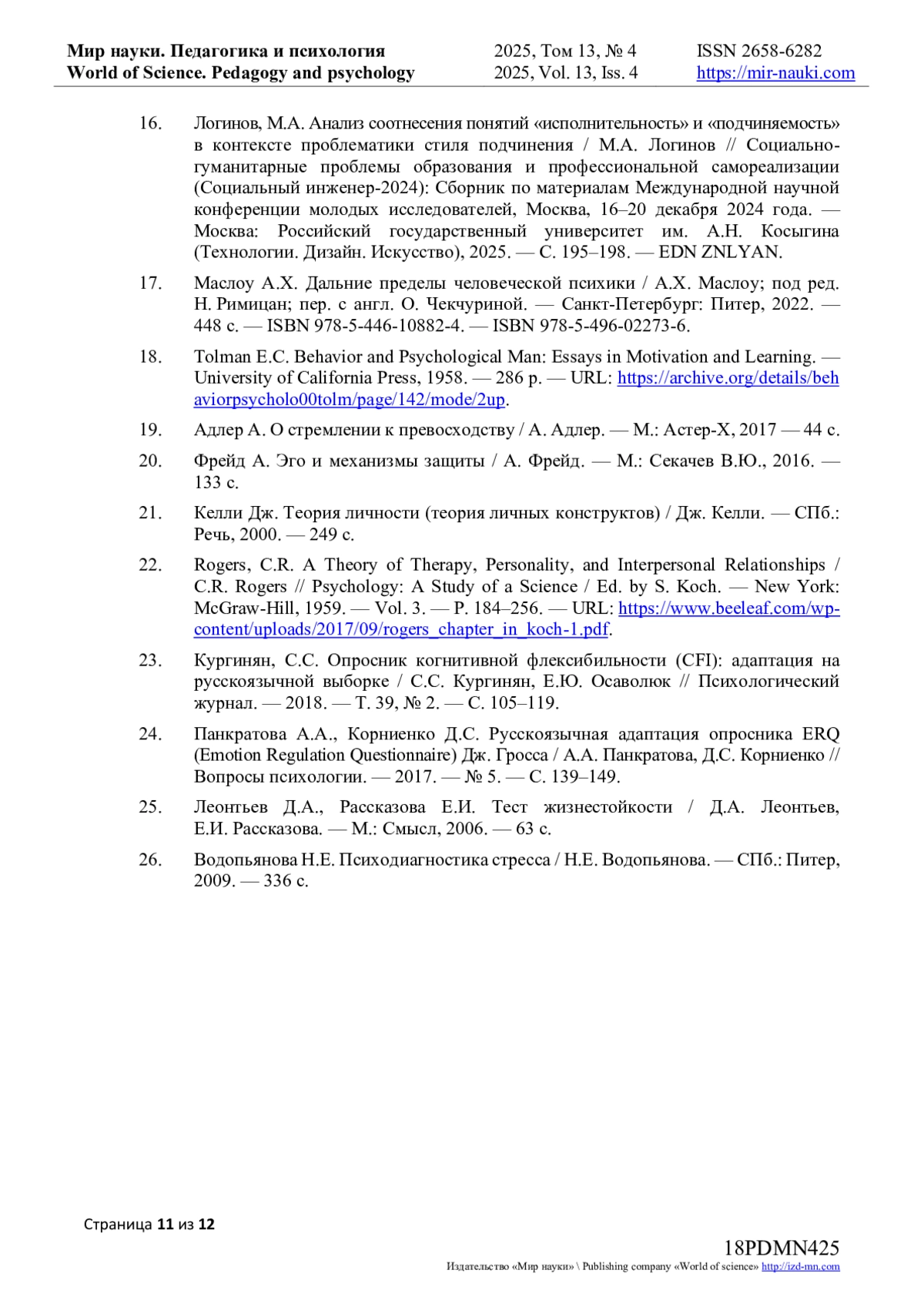 16. Логинов, М.А. Анализ соотнесения понятий “исполнительность” и “подчиняемость” в контексте проблематики стиля подчинения / М.А. Логинов // Социально-гуманитарные проблемы образования и профессиональной самореализации (Социальный инженер-2024): Сборник по материалам Международной научной конференции молодых исследователей, Москва, 16-20 декабря 2024 года. - Москва: Российский государственный университет им. А.Н. Косыгина (Технологии. Дизайн. Искусство), 2025. - С. 195-198. EDN: ZNLYAN