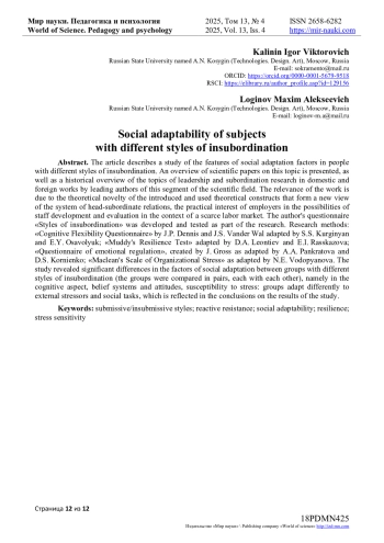В статье описывается исследование особенностей факторов социальной адаптированности у людей с разными стилями неподчинения. Представлен обзор научных работ по данной тематике, исторический обзор тематики исследования руководства и подчинения в отечественных и зарубежных работах ведущих авторов данного сегмента научного поля. Актуальность работы обусловлена теоретической новизной внедряемых и используемых теоретических конструктов формирующих новый взгляд на систему отношений руководитель-подчиненный, практическим интересом работодателей к возможностям развития и оценки персонала в условиях дефицитарности рынка труда. Разработана и апробирована в рамках проведенного исследования авторская анкета «Стили неподчинения».