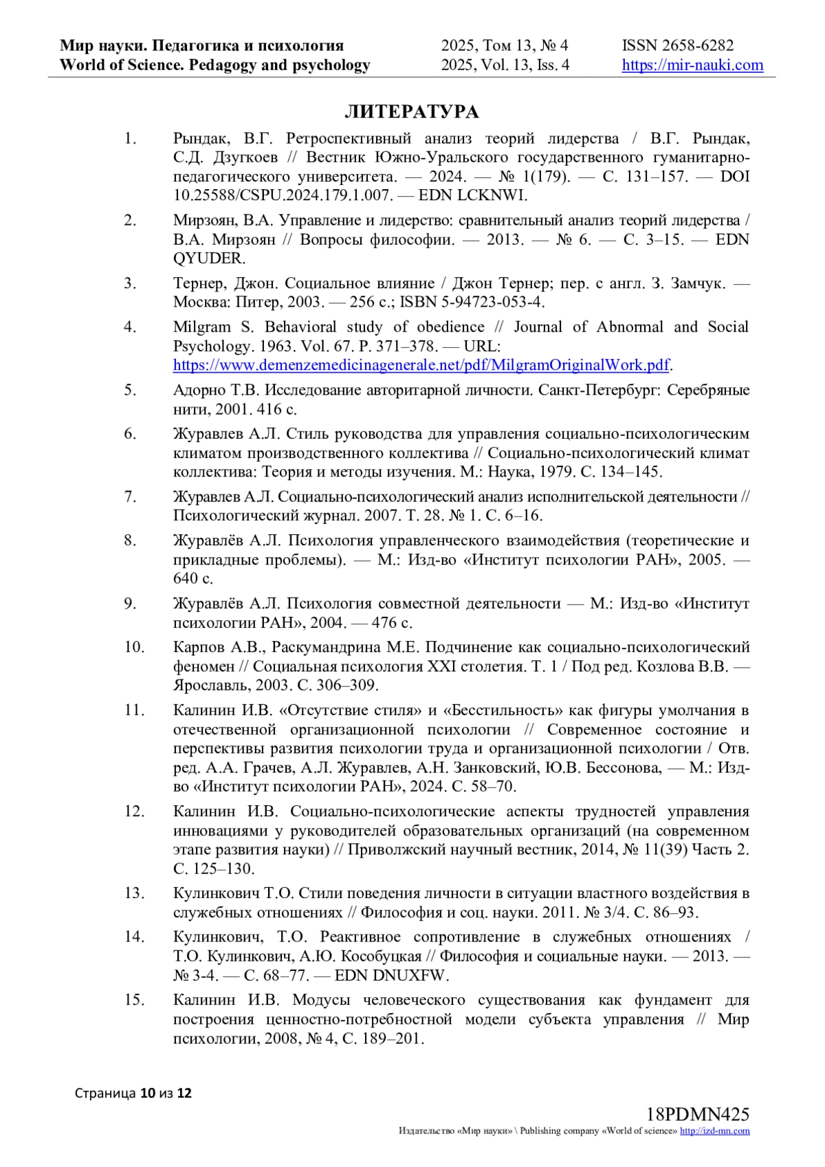 1. Рындак, В.Г. Ретроспективный анализ теорий лидерства / В.Г. Рындак, С.Д. Дзугкоев // Вестник Южно-Уральского государственного гуманитарно-педагогического университета. - 2024. - № 1(179). - С. 131-157. DOI: 10.25588/CSPU.2024.179.1.007 EDN: LCKNWI