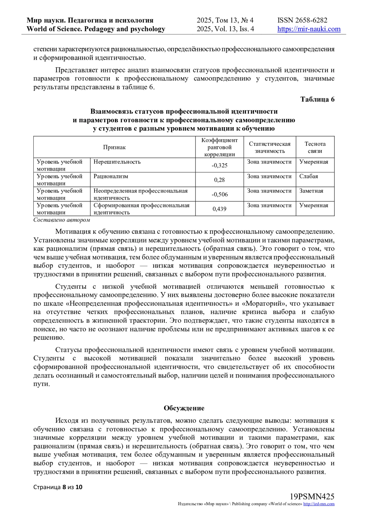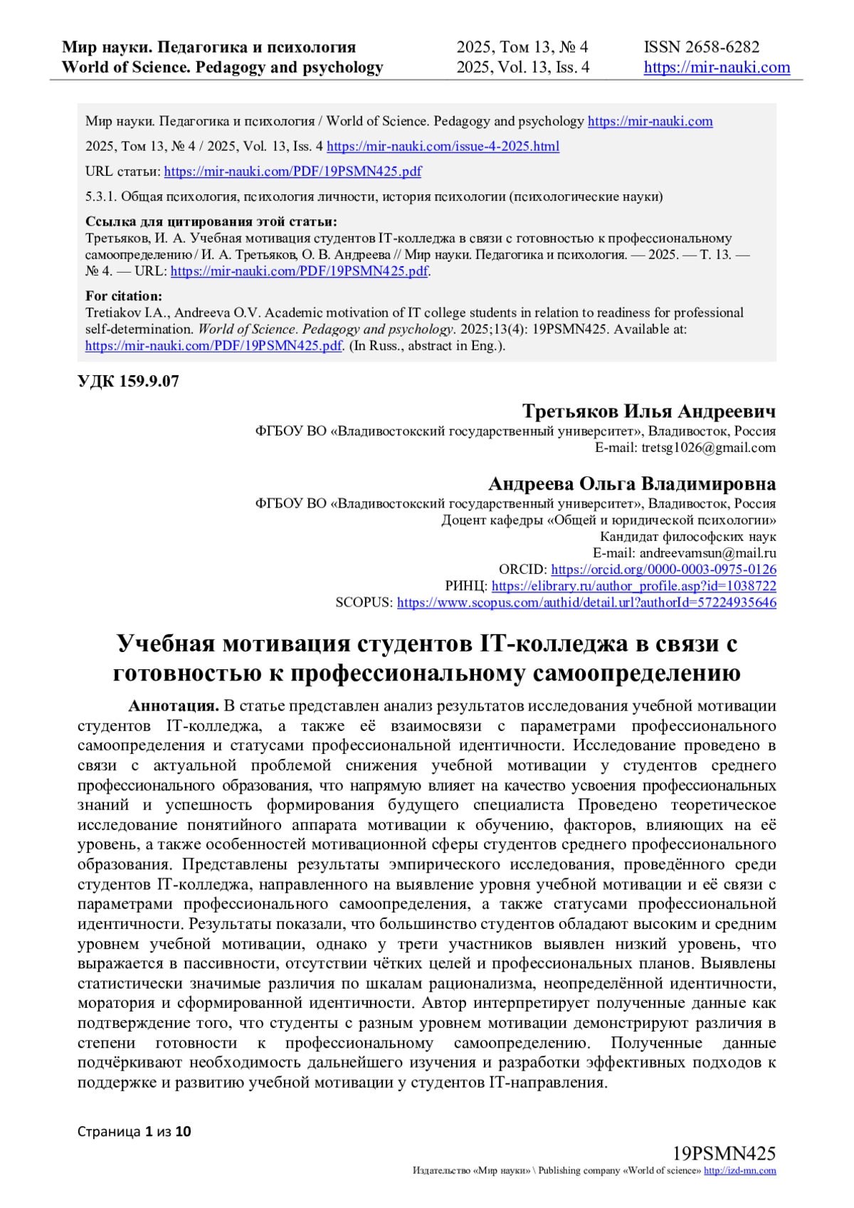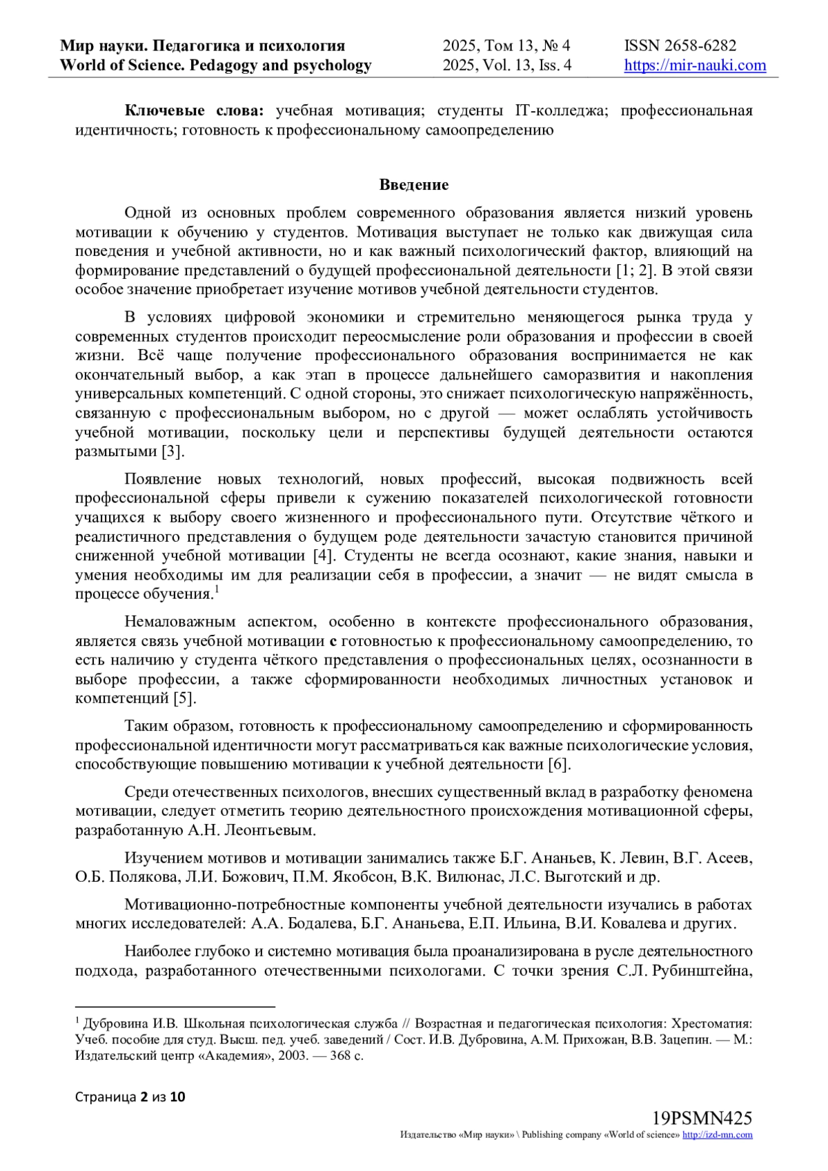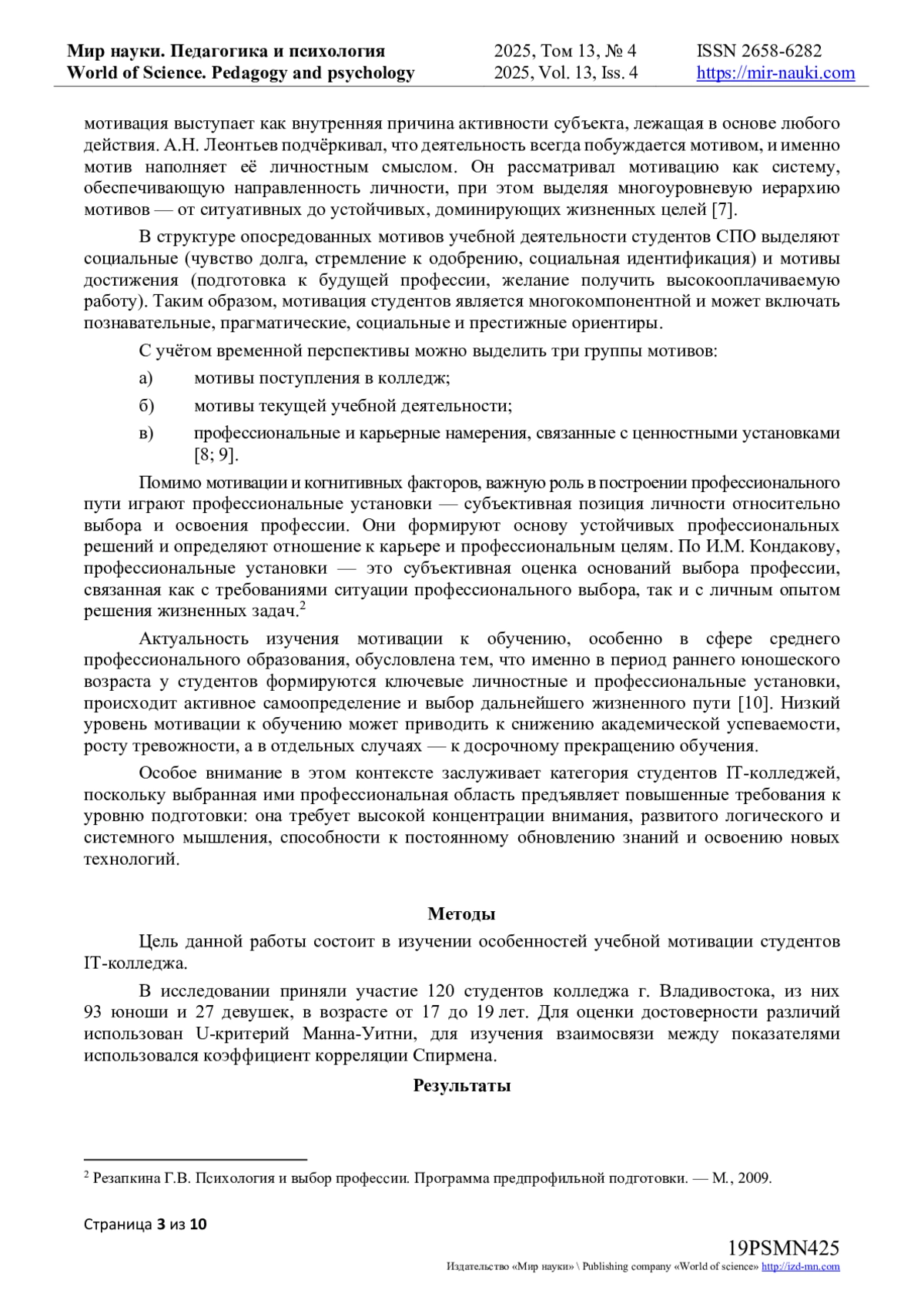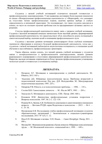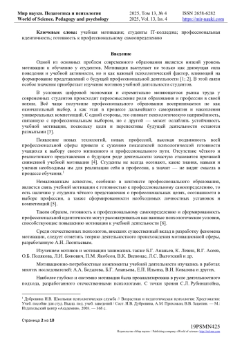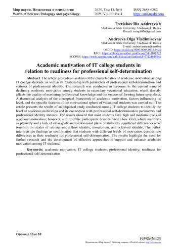 В статье представлен анализ результатов исследования учебной мотивации студентов IT-колледжа, а также её взаимосвязи с параметрами профессионального самоопределения и статусами профессиональной идентичности. Исследование проведено в связи с актуальной проблемой снижения учебной мотивации у студентов среднего профессионального образования, что напрямую влияет на качество усвоения профессиональных знаний и успешность формирования будущего специалиста Проведено теоретическое исследование понятийного аппарата мотивации к обучению, факторов, влияющих на её уровень, а также особенностей мотивационной сферы студентов среднего профессионального образования. Представлены результаты эмпирического исследования, проведённого среди студентов IT-колледжа, направленного на выявление уровня учебной мотивации и её связи с параметрами профессионального самоопределения, а также статусами профессиональной идентичности. Результаты показали, что большинство студентов обладают высоким и средним уровнем учебной мотивации, однако у трети участников выявлен низкий уровень, что выражается в пассивности, отсутствии чётких целей и профессиональных планов. Выявлены статистически значимые различия по шкалам рационализма, неопределённой идентичности, моратория и сформированной идентичности. Автор интерпретирует полученные данные как подтверждение того, что студенты с разным уровнем мотивации демонстрируют различия в степени готовности к профессиональному самоопределению. Полученные данные подчёркивают необходимость дальнейшего изучения и разработки эффективных подходов к поддержке и развитию учебной мотивации у студентов IT-направления.