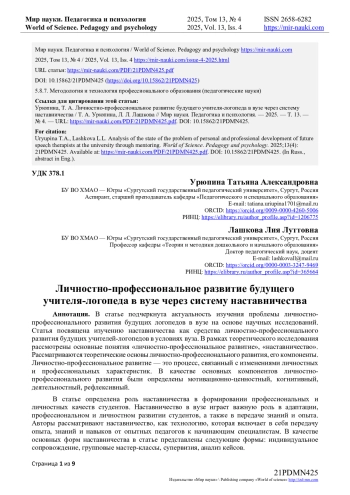 В статье подчеркнута актуальность изучения проблемы личностно-профессионального развития будущих логопедов в вузе на основе научных исследований. Статья посвящена изучению наставничества как средства личностно-профессионального развития будущих учителей-логопедов в условиях вуза. В рамках теоретического исследования рассмотрены основные понятия «личностно-профессиональное развитие», «наставничество». Рассматриваются теоретические основы личностно-профессионального развития, его компоненты. Личностно-профессиональное развитие - это процесс, связанный с изменениями личностных и профессиональных характеристик. В качестве основных компонентов личностно-профессионального развития были определены мотивационно-ценностный, когнитивный, деятельностный, рефлексивный.