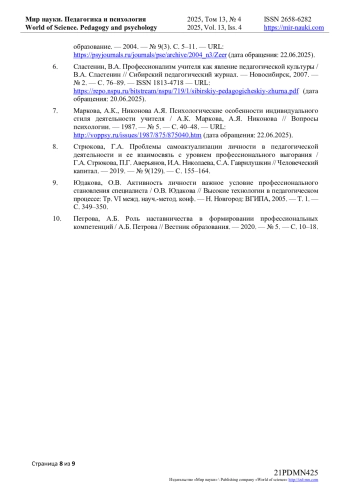 6. Сластенин, В.А. Профессионализм учителя как явление педагогической культуры / В.А. Сластенин // Сибирский педагогический журнал. - Новосибирск, 2007. - № 2. - C. 76-89. - ISSN 1813-4718 - URL: https://repo.nspu.ru/bitstream/nspu/719/1/sibirskiy-pedagogicheskiy-zhurna.pdf (дата обращения: 20.06.2025). EDN: PGXXTD