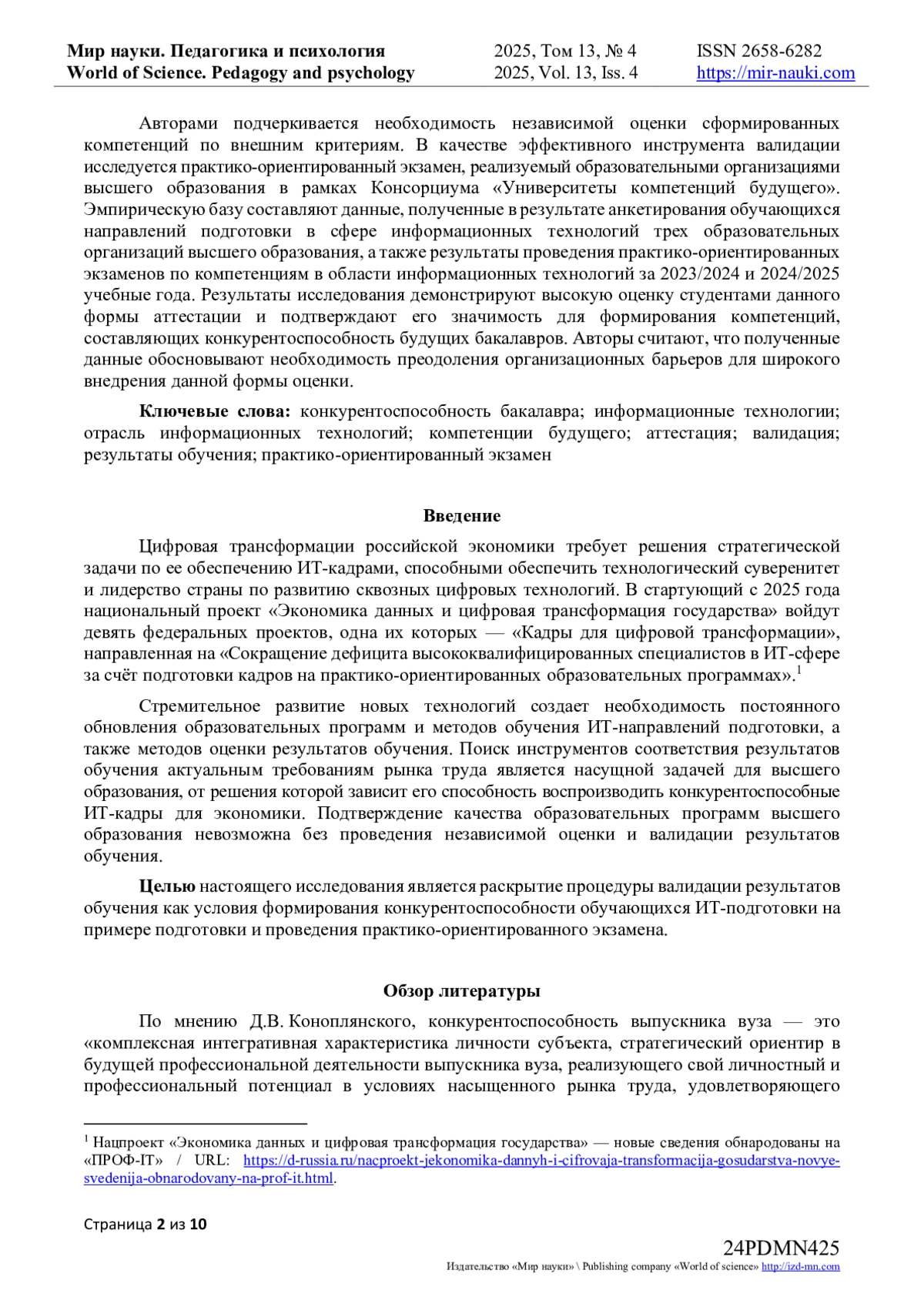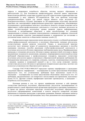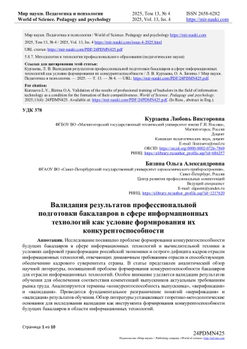 Исследование посвящено проблеме формирования конкурентоспособности будущих бакалавров в сфере информационных технологий и вычислительной техники в условиях цифровой трансформации российской экономики и острого дефицита кадров отрасли информационных технологий, отвечающих динамичным требованиям отрасли и способствующих обеспечению кадрового суверенитета страны. В статье представлен аналитический обзор научной литературы, посвященной проблеме формирования конкурентоспособности бакалавров для отрасли информационных технологий. Особое внимание уделяется валидации результатов обучения для обеспечения соответствия компетенций выпускников актуальным требованиям рынка труда. Анализируются термины «конкурентоспособность выпускника», «верификация» и «валидация». Проводится фундаментальное разграничение понятий «верификация» и «валидация» результатов обучения. Обзор литературы устанавливает теоретико-методологические основания для исследования валидации как инструмента формирования конкурентоспособности будущих бакалавров в области информационных технологий.