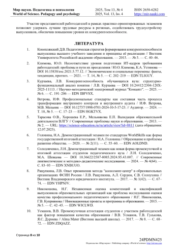7. Солодовченко, Л.Н. Демонстрационный экзамен как новая форма промежуточной и итоговой аттестации студентов педагогического вуза / Л.Н. Солодовченко, М.А. Шевцова // Современные лингвистические и методико-дидактические исследования. - 2024. - № 4(64). - С. 83-93. DOI: 10.36622/2587-8085.2024.95.43.007 EDN: XNBUUO