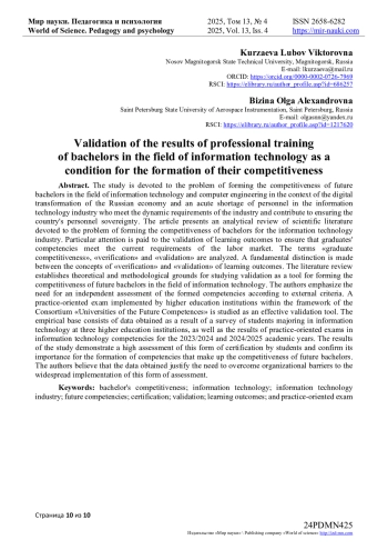 Авторами подчеркивается необходимость независимой оценки сформированных компетенций по внешним критериям. В качестве эффективного инструмента валидации исследуется практико-ориентированный экзамен, реализуемый образовательными организациями высшего образования в рамках Консорциума «Университеты компетенций будущего». Эмпирическую базу составляют данные, полученные в результате анкетирования обучающихся направлений подготовки в сфере информационных технологий трех образовательных организаций высшего образования, а также результаты проведения практико-ориентированных экзаменов по компетенциям в области информационных технологий за 2023/2024 и 2024/2025 учебные года.