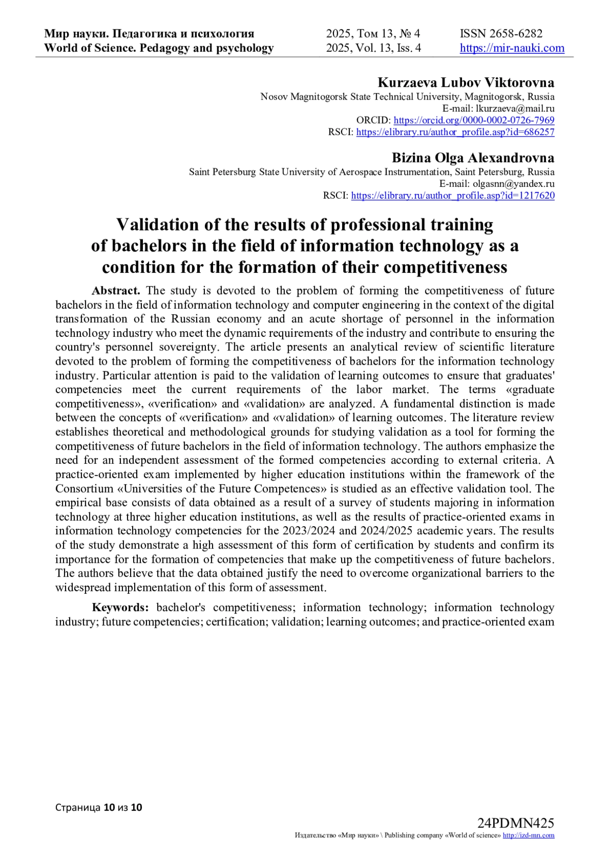 3. Курзаева, Л.В. Конкурентоспособность обучающихся вуза: структурно-функциональный анализ понятия / Л.В. Курзаева // Научно-методический электронный журнал “Концепт”. - 2025. - № 6. - С. 191-206. DOI: 10.24412/2304-120X-2025-11113 EDN: IBFVSX
