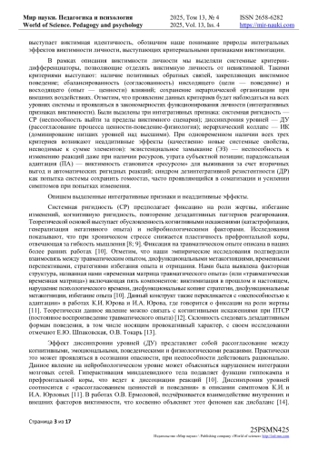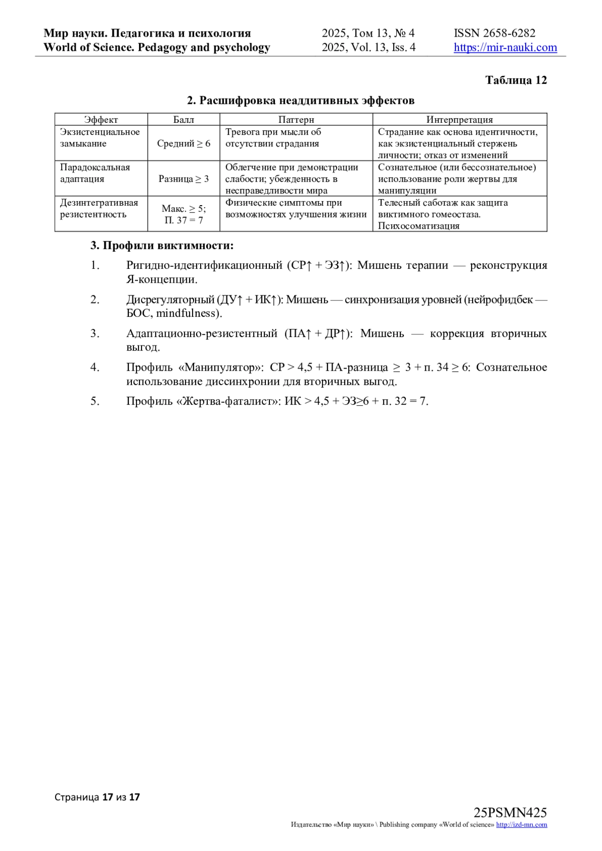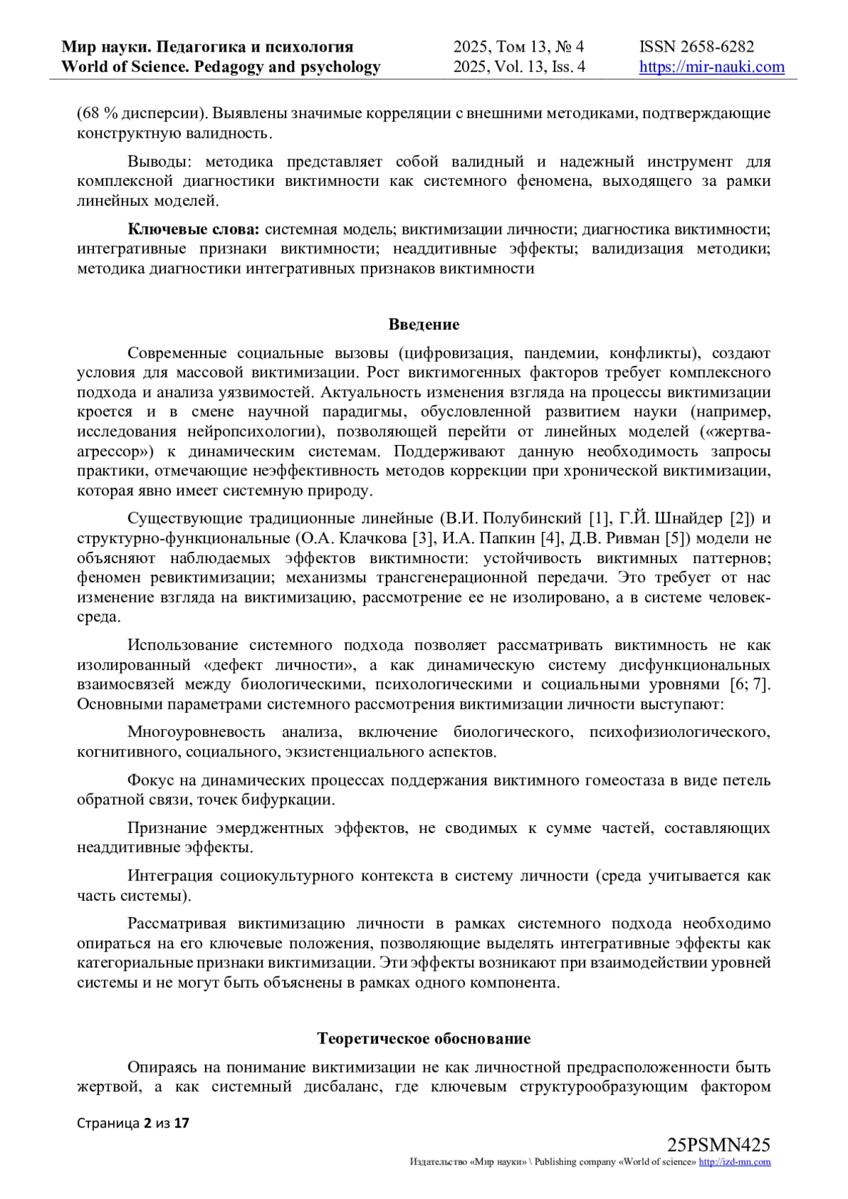 13. Шпаковская, Е.Ю. Социально-психологические особенности подростков, склонных к виктимному поведению / Е.Ю. Шпаковская, О.В. Токарь // Мир науки. Педагогика и психология. - 2025. - Т 13. - № 1. - URL: https://mir-nauki.com/PDF/31PSMN125.pdf (дата обращения: 16.07.2025). EDN: XVGZKM