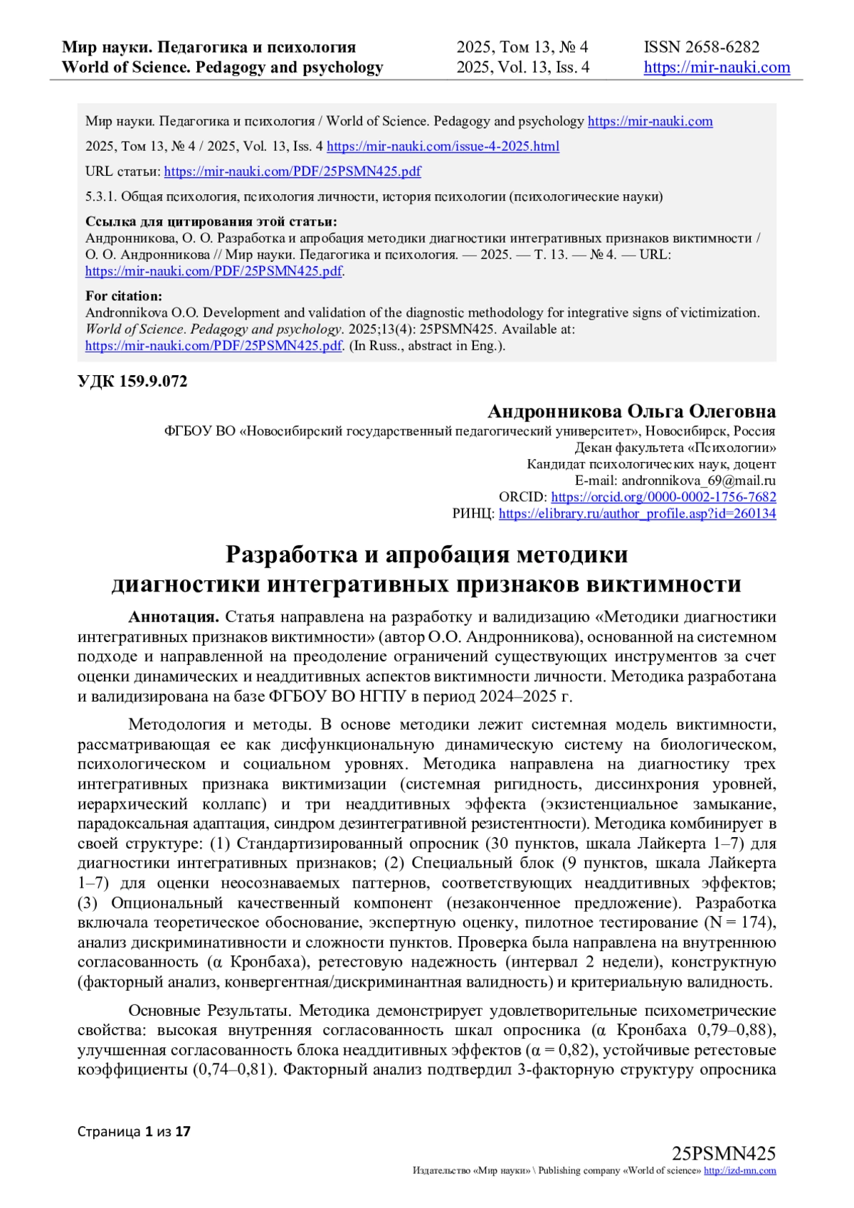 Статья направлена на разработку и валидизацию «Методики диагностики интегративных признаков виктимности» (автор О. О. Андронникова), основанной на системном подходе и направленной на преодоление ограничений существующих инструментов за счет оценки динамических и неаддитивных аспектов виктимности личности. Методика разработана и валидизирована на базе ФГБОУ ВО НГПУ в период 2024-2025 г.