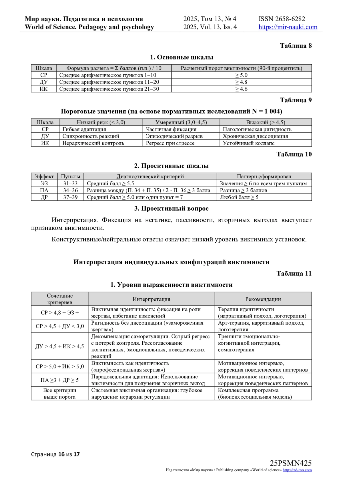Выводы: методика представляет собой валидный и надежный инструмент для комплексной диагностики виктимности как системного феномена, выходящего за рамки линейных моделей.
