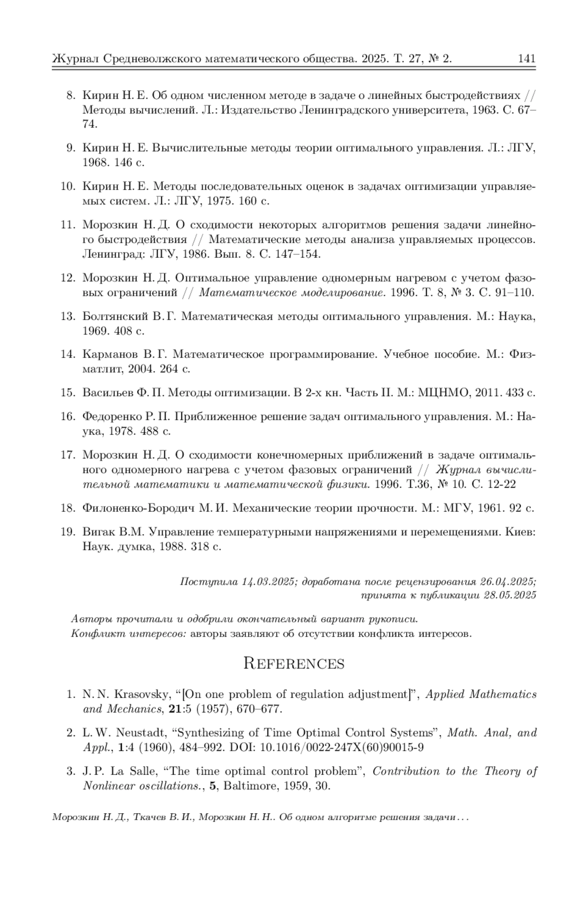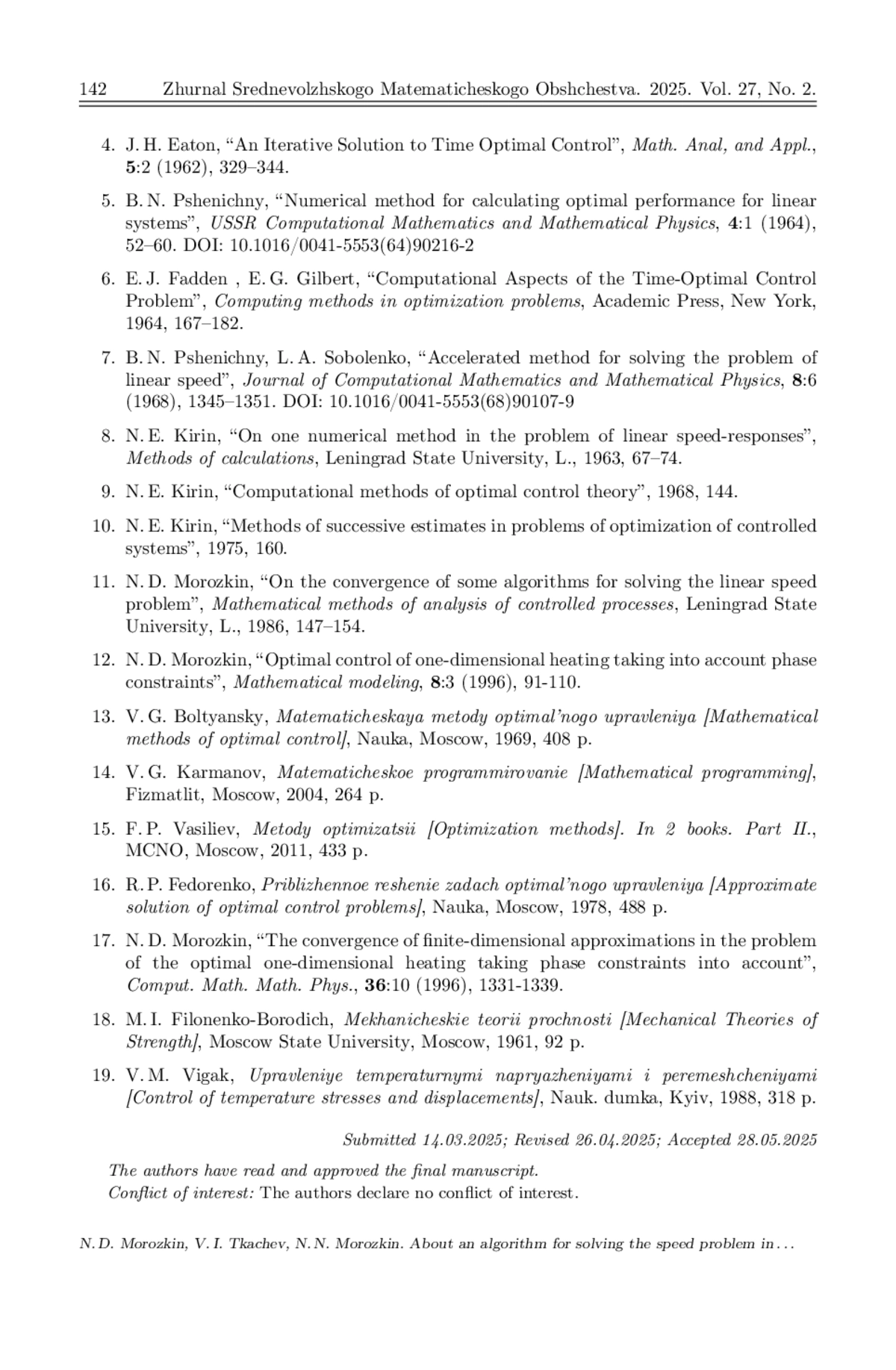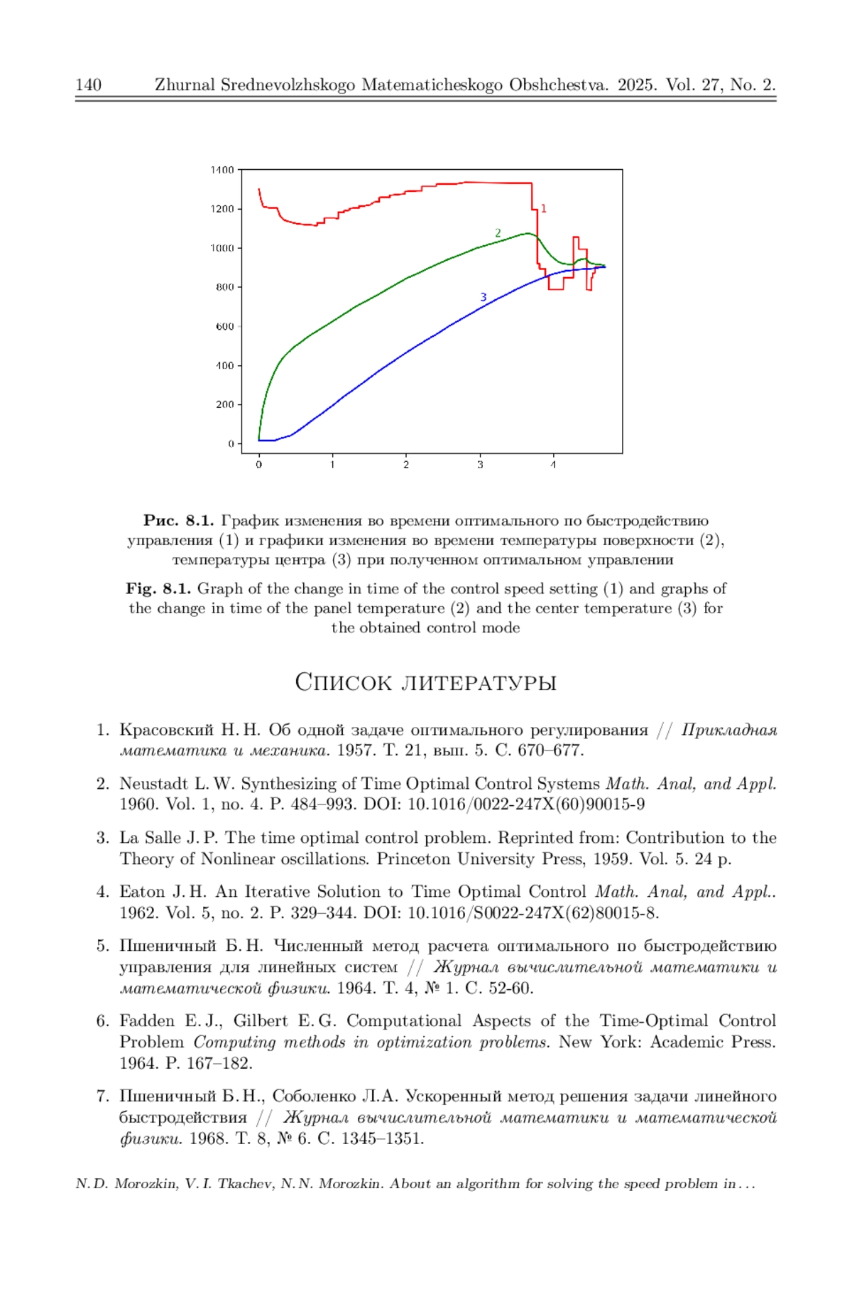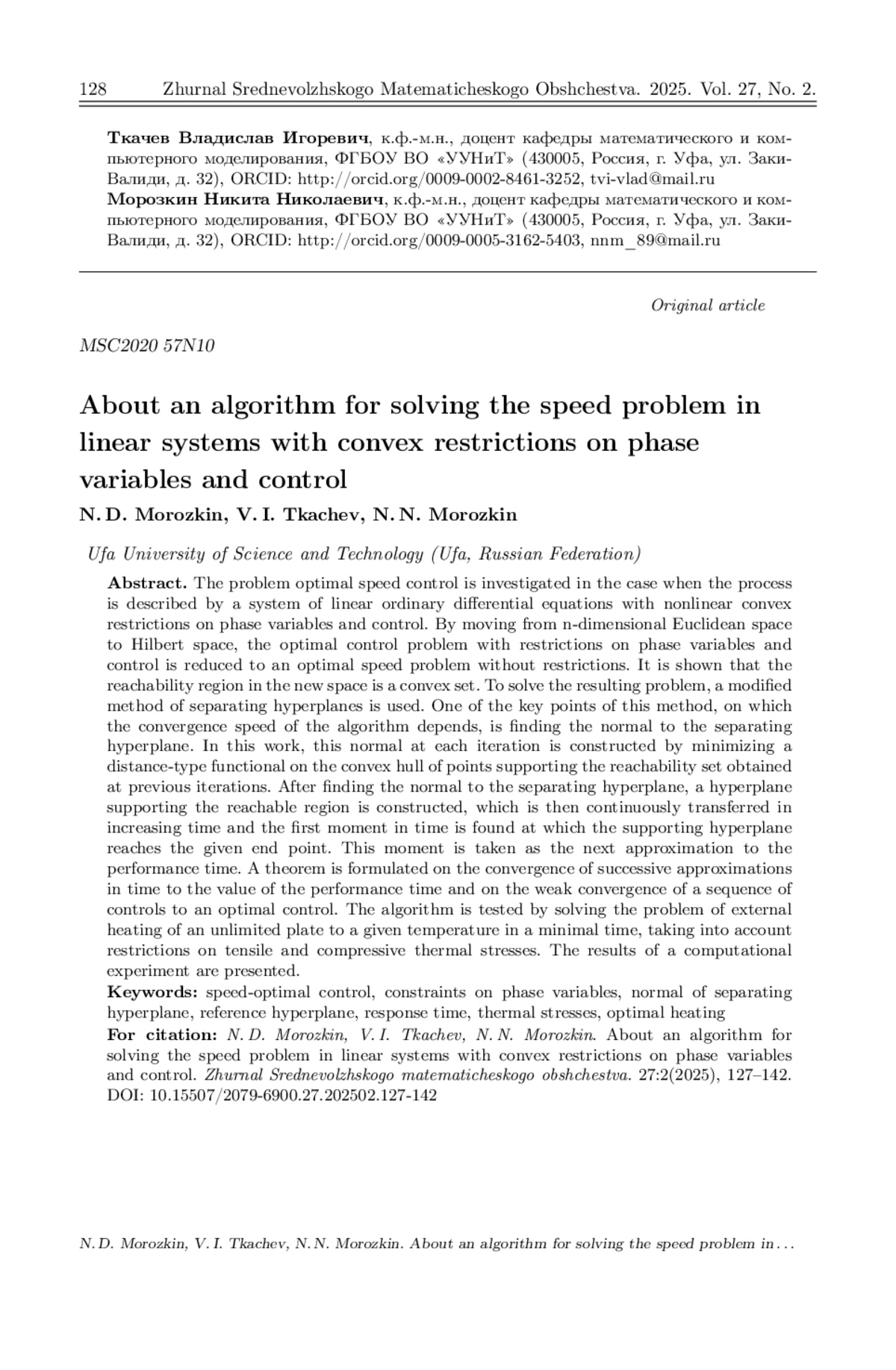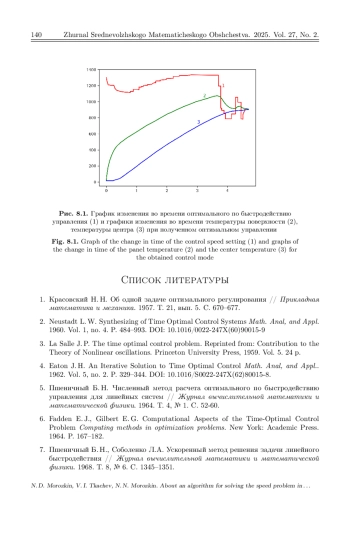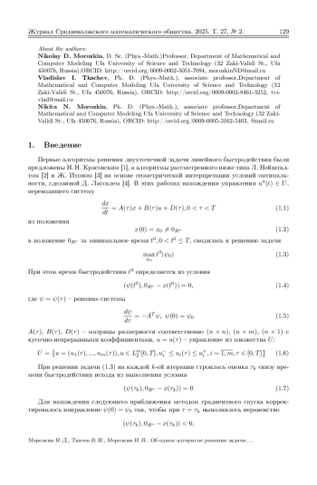 Исследуется задача поиска оптимального по быстродействию управления в случае, когда процесс описывается системой линейных обыкновенных дифференциальных уравнений с нелинейными выпуклыми ограничениями на фазовые переменные и управление. Путем перехода из n-мерного евклидова пространства в гильбертово пространство задача оптимального управления с ограничениями на фазовые переменные и управление сводится к задаче оптимального быстродействия без ограничений. Показано, что область достижимости в новом пространстве является выпуклым множеством. Для решения полученной задачи используется модифицированный метод разделяющих гиперплоскостей. Одним из ключевых моментов этого метода, от которого зависит скорость сходимости алгоритма, является нахождение нормали разделяющей гиперплоскости. В настоящей работе нормаль разделяющей гиперплоскости на каждой итерации строится путем минимизации функционала типа расстояния на выпуклой оболочке опорных к множеству достижимости точек, полученных на предыдущих итерациях. После нахождения нормали, разделяющей гиперплоскости, строится опорная к области достижимости гиперплоскость, которая затем непрерывно переносится по возрастанию времени и находится первый момент времени, при котором опорная гиперплоскость достигнет заданной конечной точки. Этот момент времени и принимается за очередное приближение времени быстродействия. Сформулирована теорема о сходимости последовательных приближений по времени к значению времени быстродействия и о слабой сходимости последовательности управлений к оптимальному управлению. Алгоритм апробирован на решении задачи внешнего нагрева неограниченной пластины до заданной температуры за минимальное время с учетом ограничений на растягивающие и сжимающие термонапряжения. Приведены результаты вычислительного эксперимента.