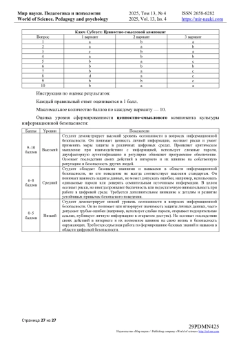 Полученные результаты демонстрируют неравномерность сформированности различных компонентов культуры информационной безопасности, выявляя наиболее проблемные зоны, где при относительно сильной технической базе, наблюдаются значительные пробелы в когнитивных, а особенно в поведенческих и ценностно-смысловых аспектах. Представленная диагностическая система обладает высоким потенциалом для целевого совершенствования образовательных программ и формирования устойчивых паттернов безопасного поведения в цифровой среде.