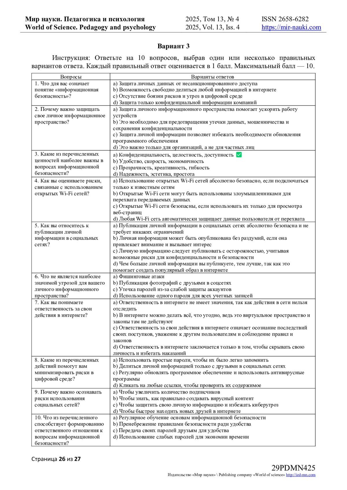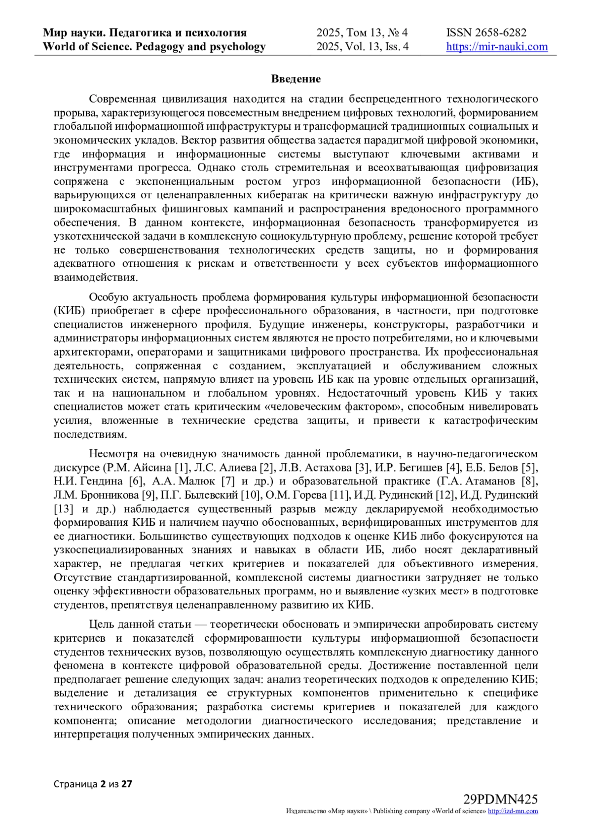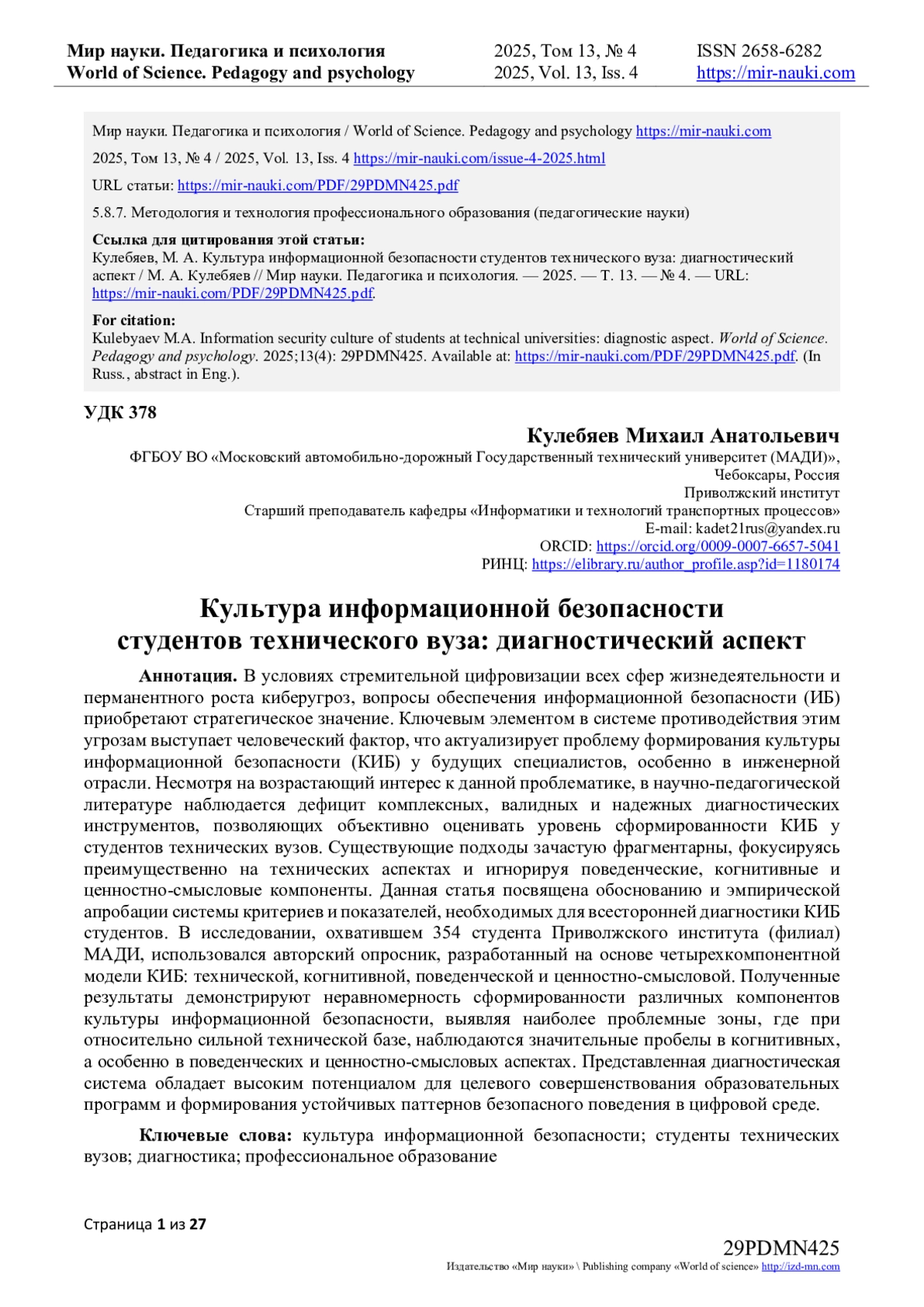 В условиях стремительной цифровизации всех сфер жизнедеятельности и перманентного роста киберугроз, вопросы обеспечения информационной безопасности (ИБ) приобретают стратегическое значение. Ключевым элементом в системе противодействия этим угрозам выступает человеческий фактор, что актуализирует проблему формирования культуры информационной безопасности (КИБ) у будущих специалистов, особенно в инженерной отрасли. Несмотря на возрастающий интерес к данной проблематике, в научно-педагогической литературе наблюдается дефицит комплексных, валидных и надежных диагностических инструментов, позволяющих объективно оценивать уровень сформированности КИБ у студентов технических вузов. Существующие подходы зачастую фрагментарны, фокусируясь преимущественно на технических аспектах и игнорируя поведенческие, когнитивные и ценностно-смысловые компоненты. Данная статья посвящена обоснованию и эмпирической апробации системы критериев и показателей, необходимых для всесторонней диагностики КИБ студентов. В исследовании, охватившем 354 студента Приволжского института (филиал) МАДИ, использовался авторский опросник, разработанный на основе четырехкомпонентной модели КИБ: технической, когнитивной, поведенческой и ценностно-смысловой.