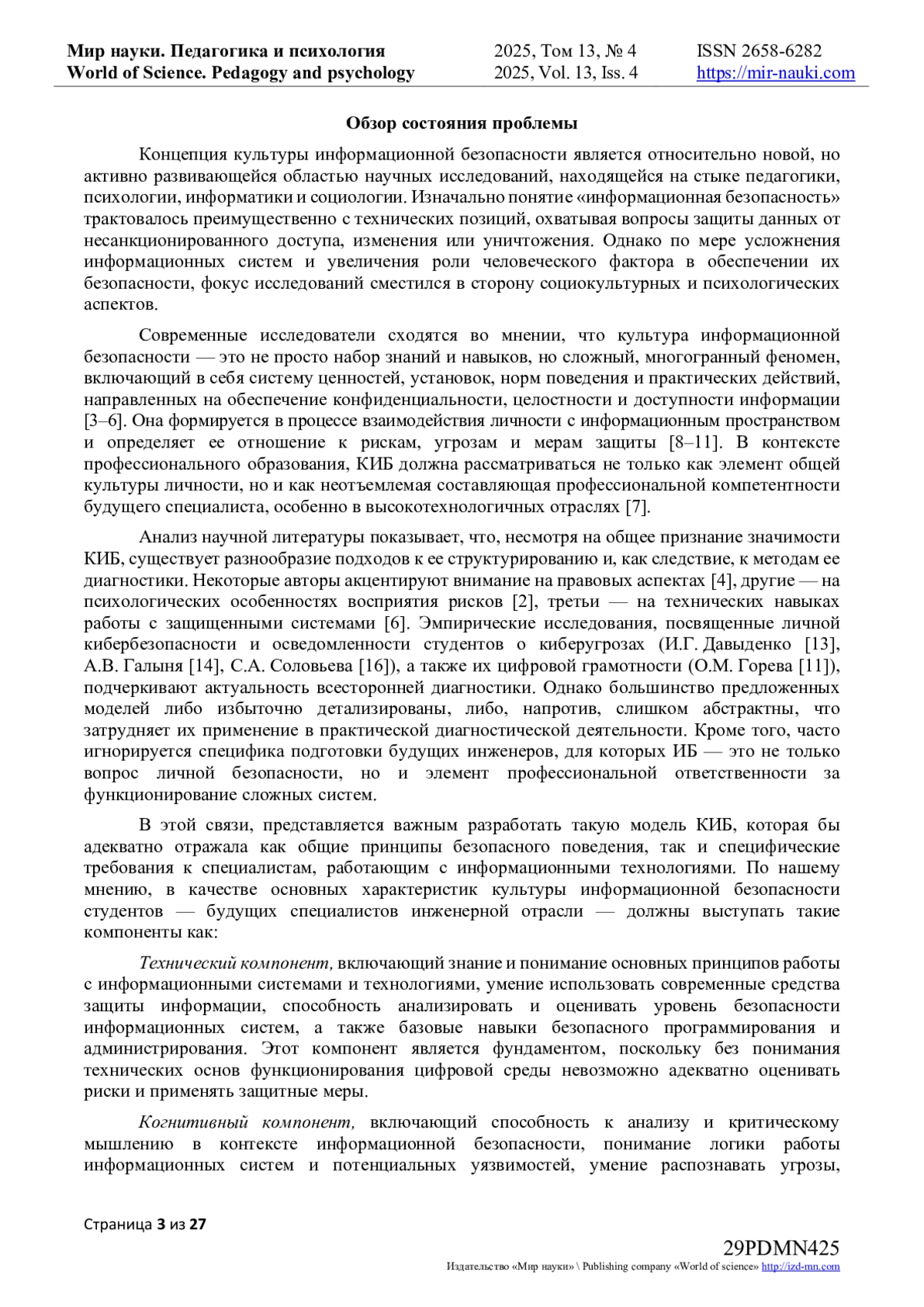 13. Давыденко, И.Г. Личная кибербезопасность студентов: эмпирическое исследование пользователей цифровых устройств и интернета / И.Г. Давыденко, Д.Н. Мисиров, М.А. Акопян // Международный научно-исследовательский журнал. - 2025 - № 1(151). EDN: QQFISM