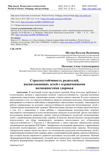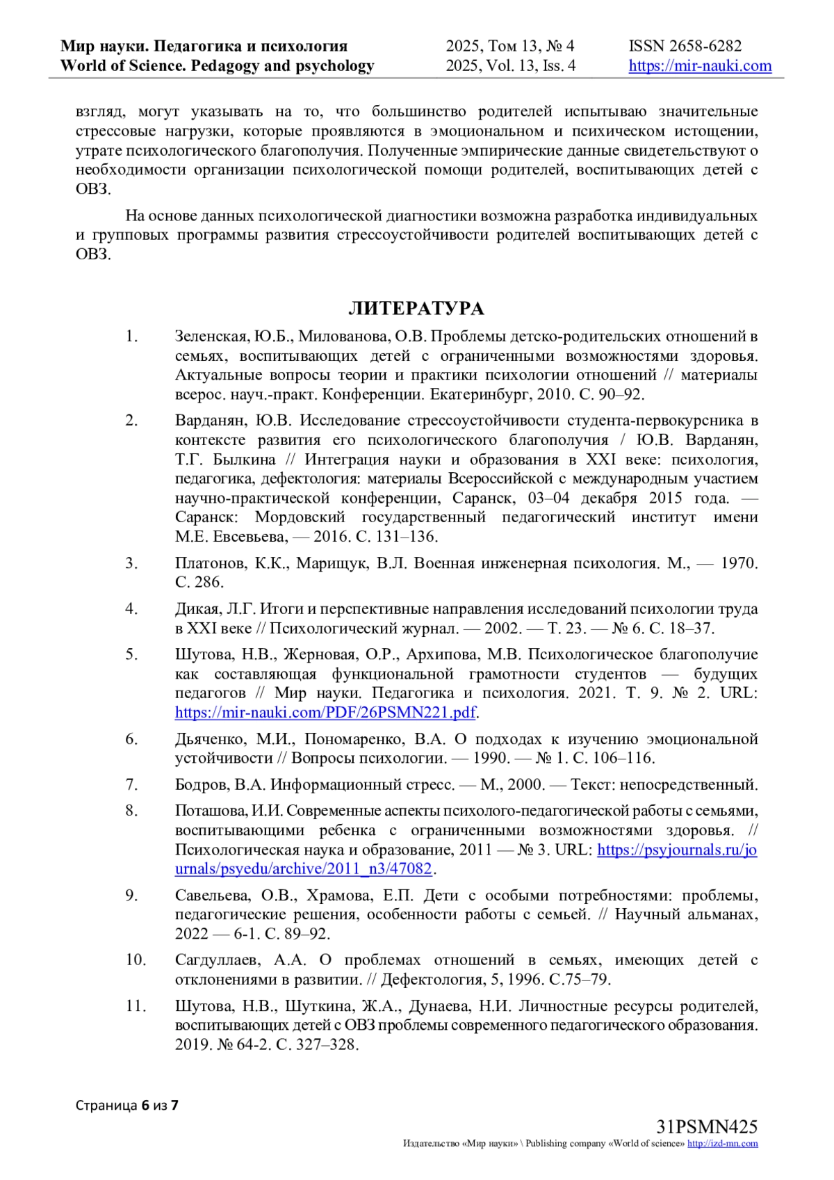 11. Шутова, Н.В., Шуткина, Ж.А., Дунаева, Н.И. Личностные ресурсы родителей, воспитывающих детей с ОВЗ проблемы современного педагогического образования. 2019. № 64-2. С. 327-328. EDN: EJCFQY