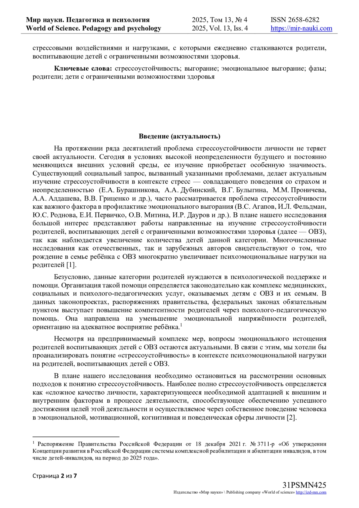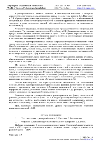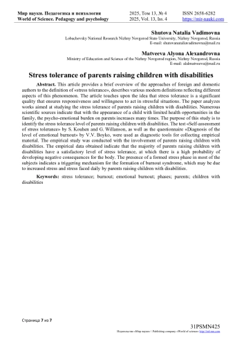 В настоящей статье представлен краткий обзор подходов зарубежных и отечественных авторов к определению понятия «стрессоустойчивость», описаны различные современные определения, отражающие разные стороны данного явления. В статье затронуты представления о том, что стрессоустойчивость является значимым качеством, обеспечивающим реагирование и готовность действовать в напряженных стрессогенных ситуациях. Анализируются работы направленные на изучение стрессоустойчивости родителей воспитывающих детей с ограниченными возможностями здоровья. Многочисленные научные источники свидетельствуют о том, что с появлением в семье ребёнка с ограниченными возможностями здоровья, многократно увеличиваются психоэмоциональные нагрузки на родителей. Целью настоящего исследования является выявление уровня стрессоустойчивости родителей воспитывающих детей с ограниченными возможностями здоровья. В качестве диагностического инструментария используемого для сбора эмпирического материала использовался тест «Самооценка стрессоустойчивости» С. Коухена и Г. Виллиансона, а также опросник «Диагностика уровня эмоционального выгорания» В. В. Бойко. Эмпирическое исследование проводилось с привлечением родителей, воспитывающих детей с ограниченными возможностями здоровья. Полученные эмпирические данные свидетельствуют, что большинство родителей, воспитывающих детей с ограниченными возможностями здоровья, имеют удовлетворительный уровень стрессоустойчивости, при котором высока вероятность развития негативных последствий для организма. Наличие сформированной фазы напряжения у большей части испытуемых указывает на запускающийся механизм формирования синдрома выгорания, что может быть обусловлено повышенными стрессовыми воздействиями и нагрузками, с которыми ежедневно сталкиваются родители, воспитывающие детей с ограниченными возможностями здоровья.