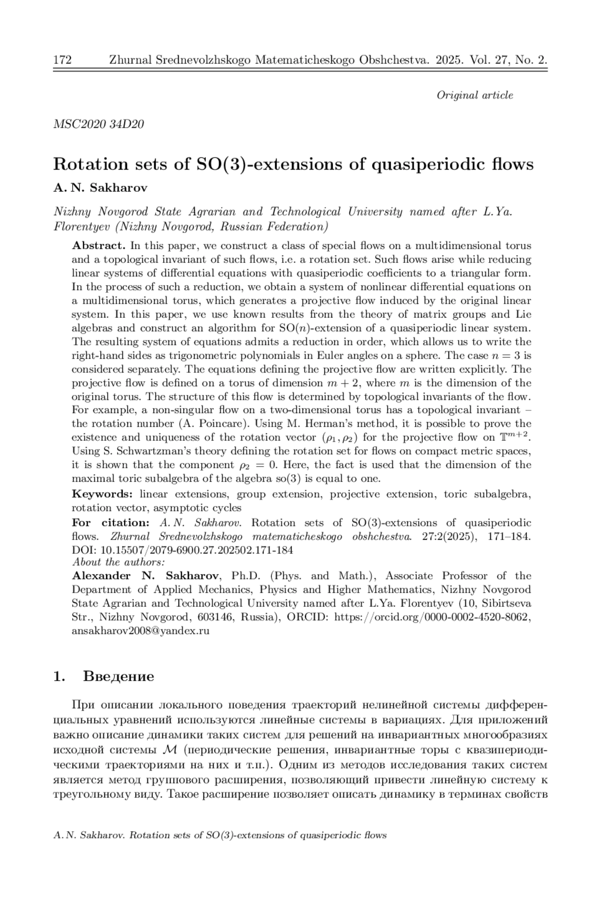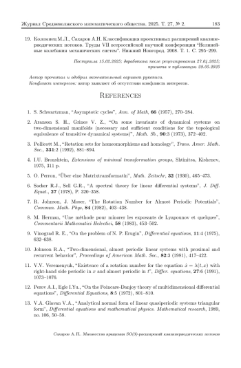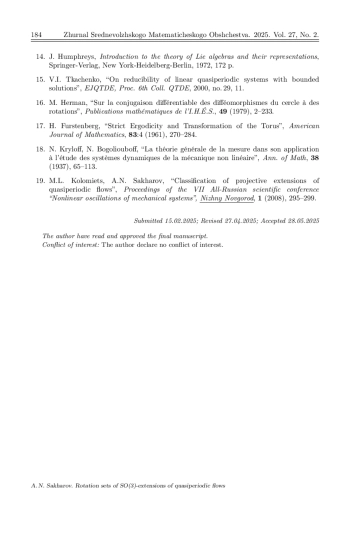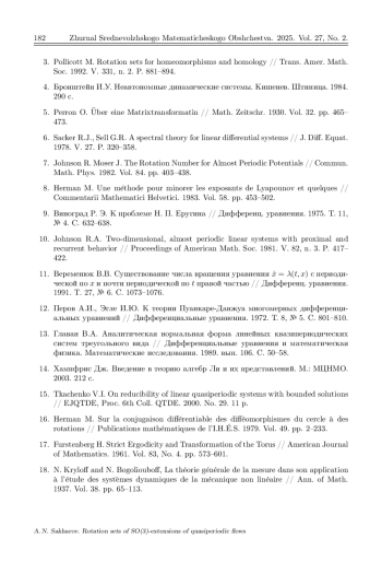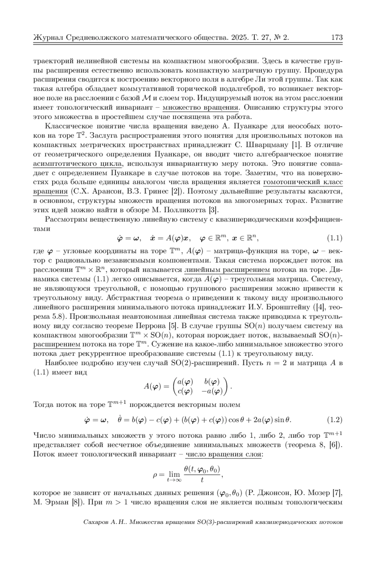 В настоящей статье строится класс специальных потоков на многомерном торе и топологический инвариант таких потоков – множество вращения. Такие потоки возникают в процессе приведения к треугольному виду линейных систем дифференциальных уравнений с квазипериодическими коэффициентами. В процессе такого приведения получается система нелинейных дифференциальных уравнений на многомерном торе, которая порождает проективный поток, индуцируемый исходной линейной системой. В работе строится алгоритм SO(n)-расширения квазипериодической линейной системы. При этом используются известные результаты из теории матричных групп и алгебр Ли. Полученная система уравнений допускает понижение порядка, что позволяет записать правые части в виде тригонометрических полиномов от углов Эйлера на сфере. Случай n = 3 рассматривается отдельно. Уравнения, определяющие проективный поток, записываются в явном виде. Проективный поток определен на торе размерности m+2, где m – размерность исходного тора. Структура этого потока определяется топологическими инвариантами потока. Например, неособый поток на двумерном торе имеет топологический инвариант – число вращения (А. Пуанкаре). Используя метод М. Эрмана, удается доказать существование и единственность вектора вращения (\rho 1, \rho 2) для проективного потока на Tm+2. С помощью теории С. Шварцмана определения множества вращения для потоков на компактных метрических пространствах показывается, что компонента \rho 2 = 0. Здесь используется факт, что размерность максимальной торической подалгебры алгебры so(3) равна единице.