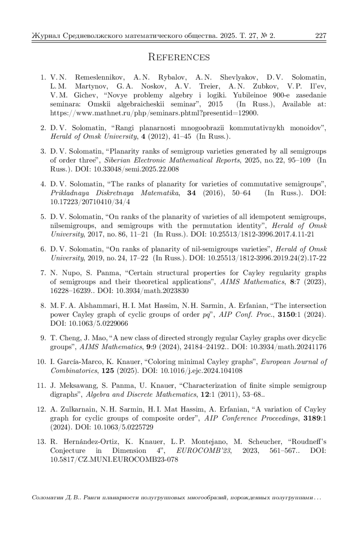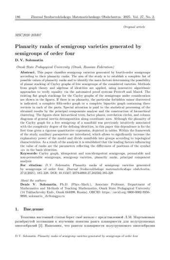 3. Соломатин Д. В. Ранги планарности полугрупповых многообразий, порождённых полугруппами третьего порядка // Сибирские электронные математические известия. 2025. Т. 22, № 1. С. 95-109. DOI: 10.33048/semi.2025.22.008