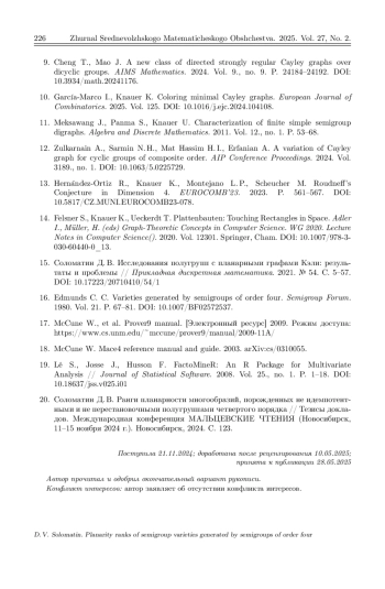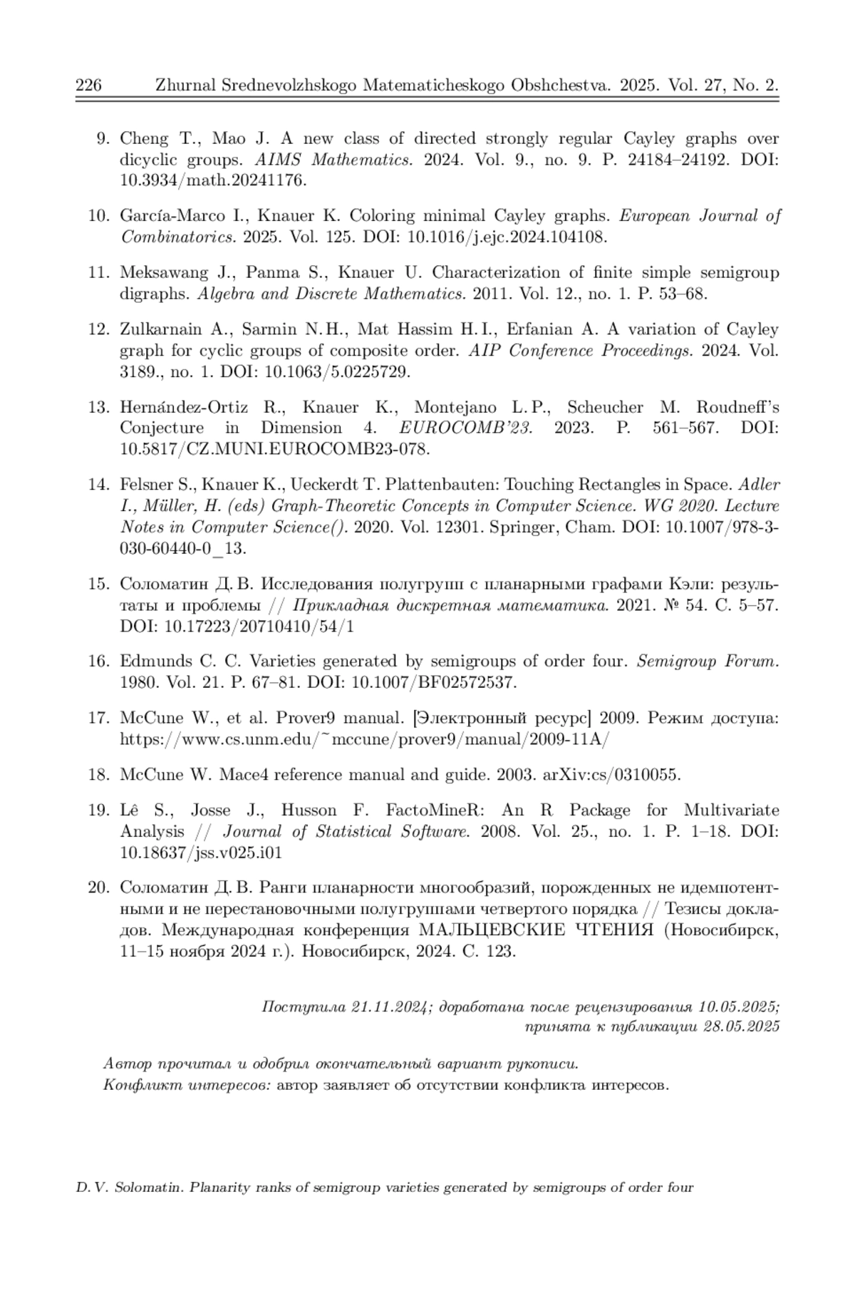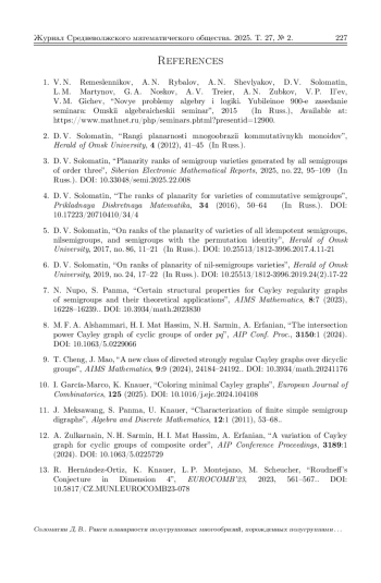 15. Соломатин Д. В. Исследования полугрупп с планарными графами Кэли: результаты и проблемы // Прикладная дискретная математика. 2021. № 54. С. 5-57. DOI: 10.17223/20710410/54/1