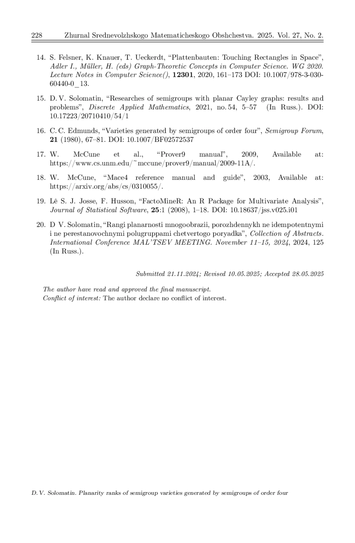 4. Соломатин Д. В. Ранги планарности многообразий коммутативных полугрупп~// Прикладная дискретная математика. 2016. Т. 34, № 4. С. 50-64. DOI: 10.17223/20710410/34/4
