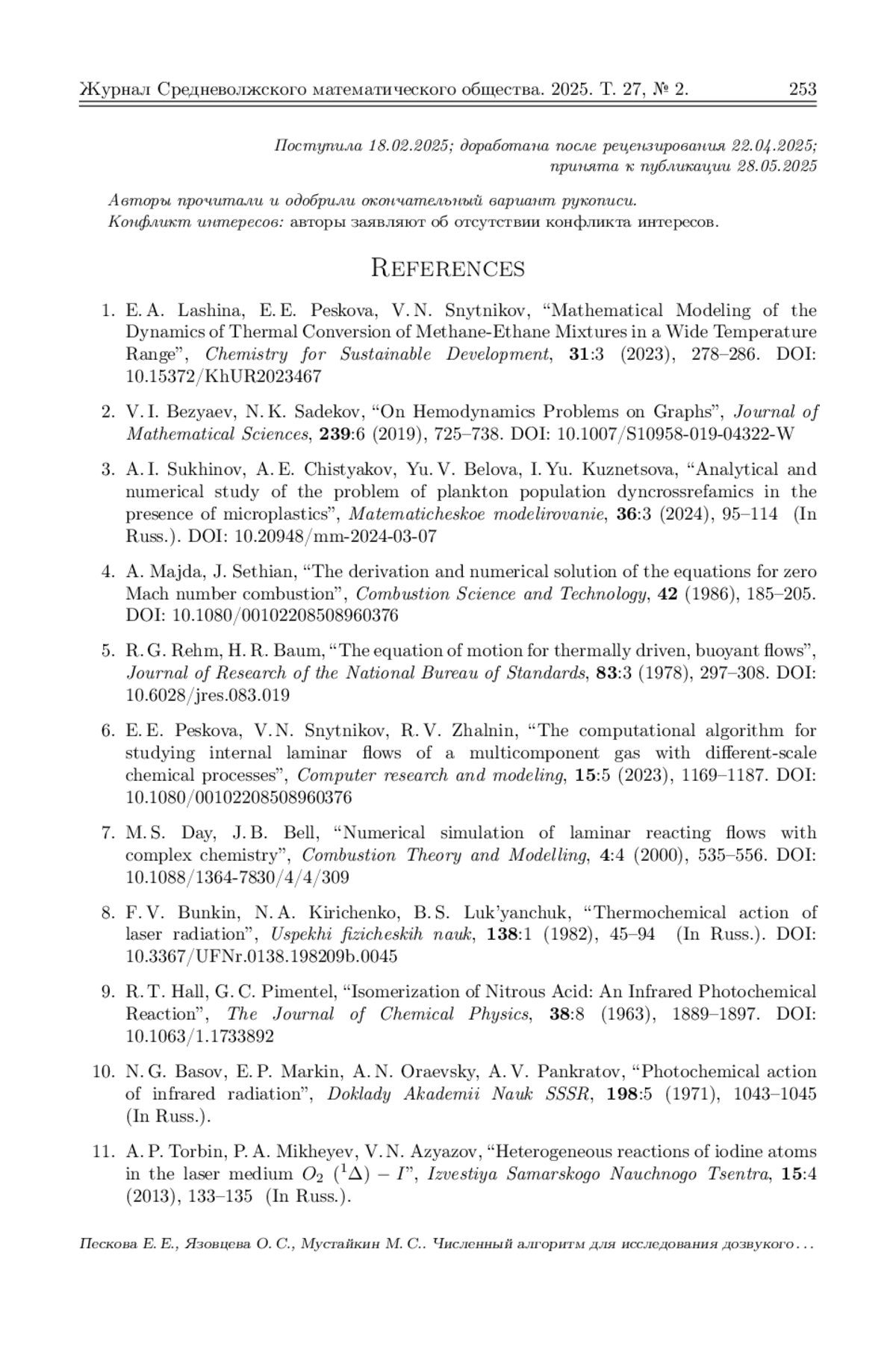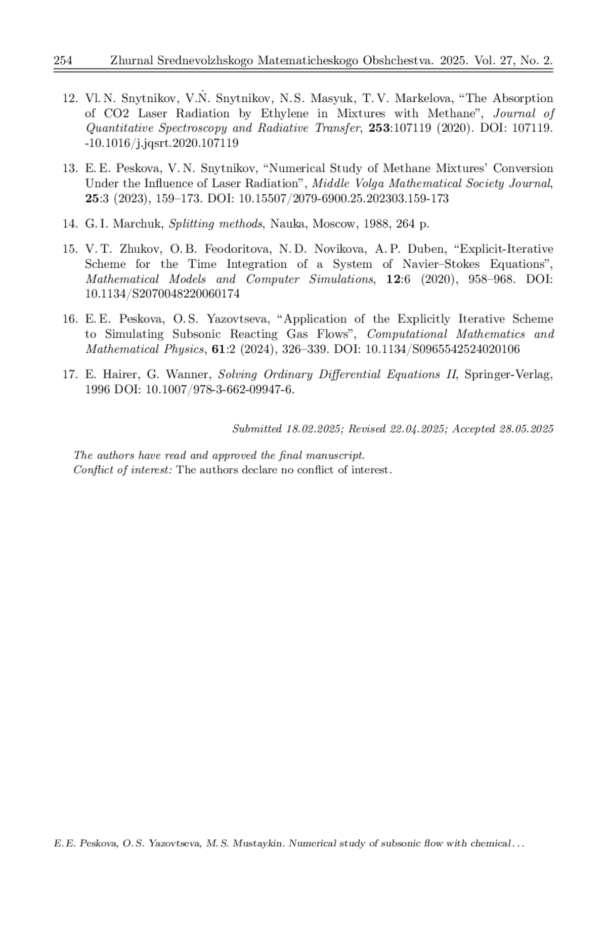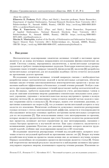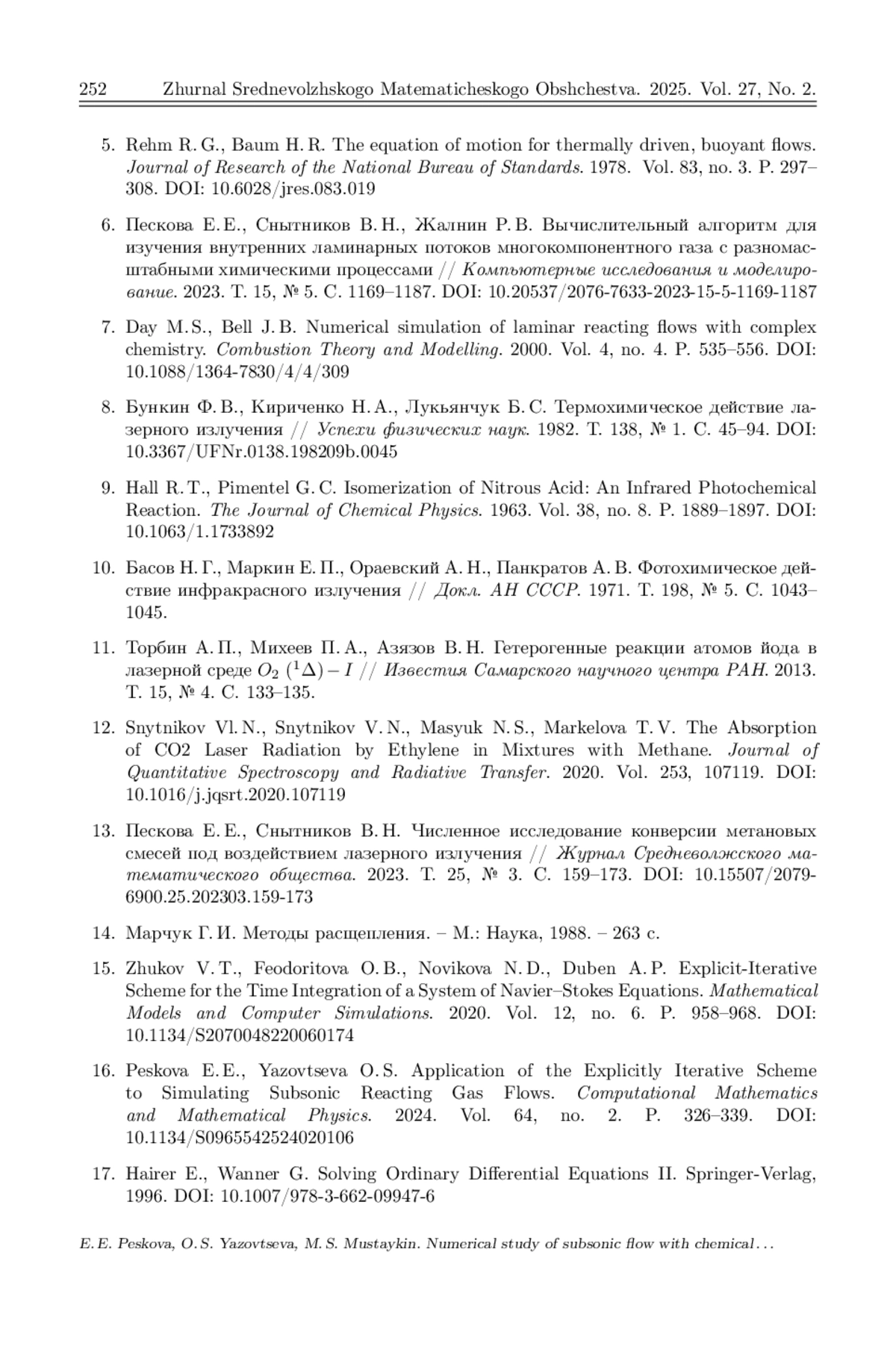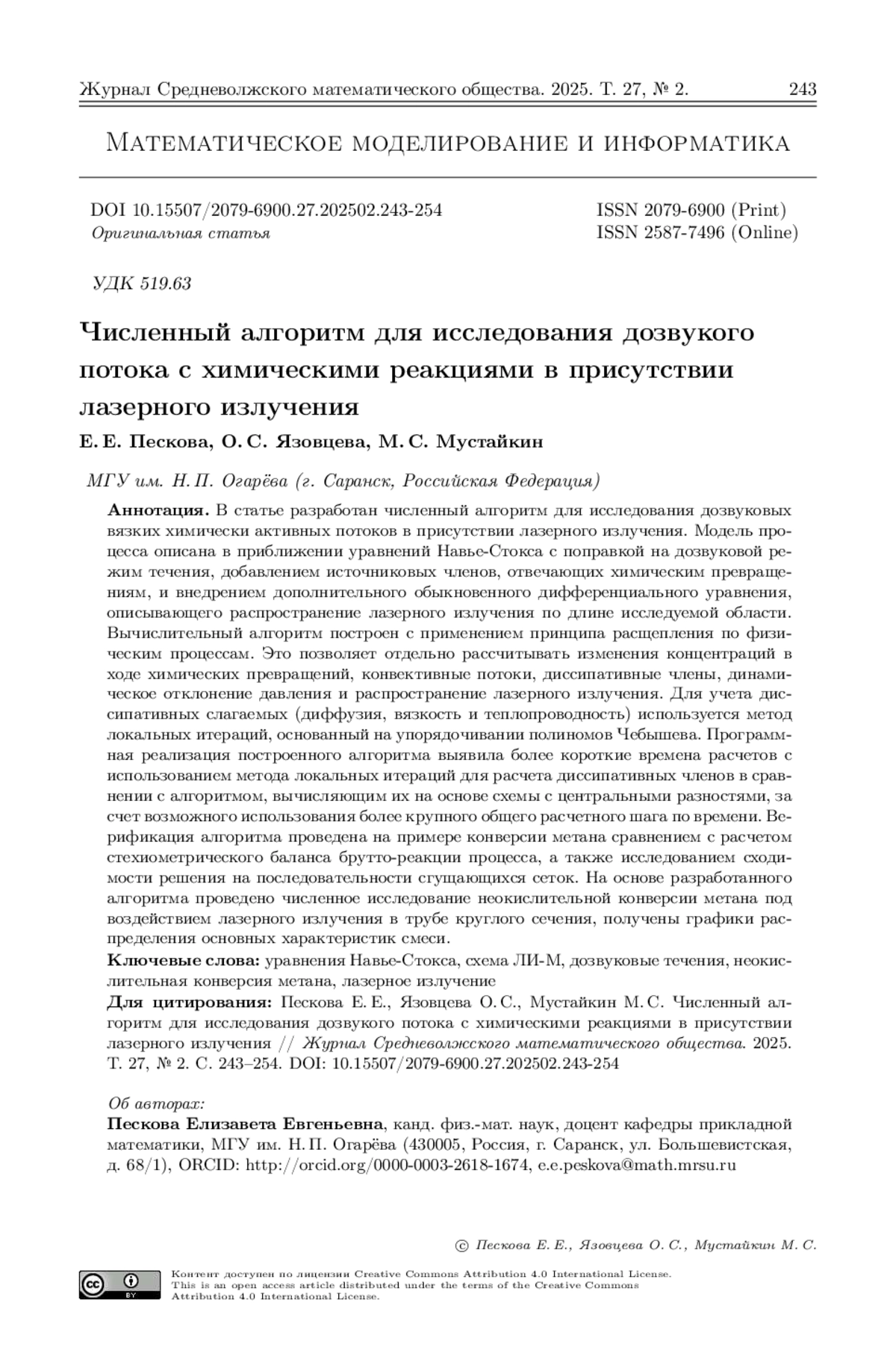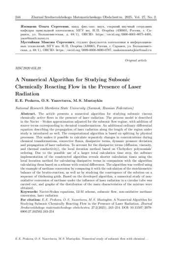 В статье разработан численный алгоритм для исследования дозвуковых вязких химически активных потоков в присутствии лазерного излучения. Модель процесса описана в приближении уравнений Навье-Стокса с поправкой на дозвуковой режим течения, добавлением источниковых членов, отвечающих химическим превращениям, и внедрением дополнительного обыкновенного дифференциального уравнения, описывающего распространение лазерного излучения по длине исследуемой области. Вычислительный алгоритм построен с применением принципа расщепления по физическим процессам. Это позволяет отдельно рассчитывать изменения концентраций в ходе химических превращений, конвективные потоки, диссипативные члены, динамическое отклонение давления и распространение лазерного излучения. Для учета диссипативных слагаемых (диффузия, вязкость и теплопроводность) используется метод локальных итераций, основанный на упорядочивании полиномов Чебышева. Программная реализация построенного алгоритма выявила более короткие времена расчетов с использованием метода локальных итераций для расчета диссипативных членов в сравнении с алгоритмом, вычисляющим их на основе схемы с центральными разностями, за счет возможного использования более крупного общего расчетного шага по времени. Верификация алгоритма проведена на примере конверсии метана сравнением с расчетом стехиометрического баланса брутто-реакции процесса, а также исследованием сходимости решения на последовательности сгущающихся сеток. На основе разработанного алгоритма проведено численное исследование неокислительной конверсии метана под воздействием лазерного излучения в трубе круглого сечения, получены графики распределения основных характеристик смеси.